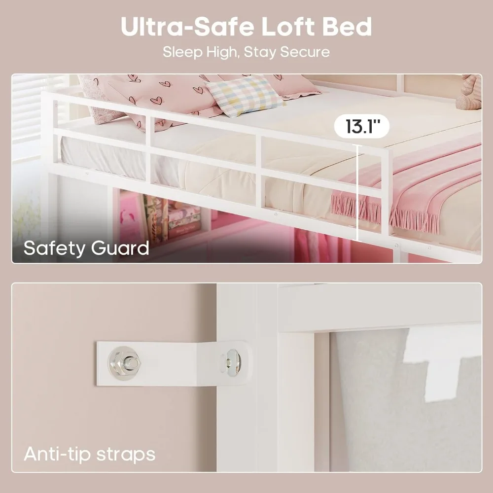 This full-size multi-functional loft bed is designed to optimize space with features like 8 large fabric drawers, 2 open shelves, a full-length clothing rack, and a customizable pegboard with 7 hooks, making it perfect for organizing clothes, books, accessories, and school supplies. The built-in study desk offers a spacious 55.4" x 14.2" workspace and includes an integrated power strip with 2 outlets, 1 USB port, and 1 Type-C port, ideal for laptops, homework, gaming, or studying. Safety is prioritized with a 13.1" full-length guardrail, anti-toppling device, and a heavy-coated steel tube frame, ensuring a secure sleep and climb experience. The dynamic RGB LED ambiance lighting under the bed frame provides over 60,000 color options and music sync, controlled via app or remote, perfect for setting the mood for various activities. The bed is constructed with industrial-grade steel slats, welded joints, and a solid build, supporting up to 900 lbs without the need for a box spring. Assembly is made easy with a press-fit slats system, clear instructions, and numbered parts, all packed in one box with shock-absorbing foam and protective wooden boards for safe delivery.
