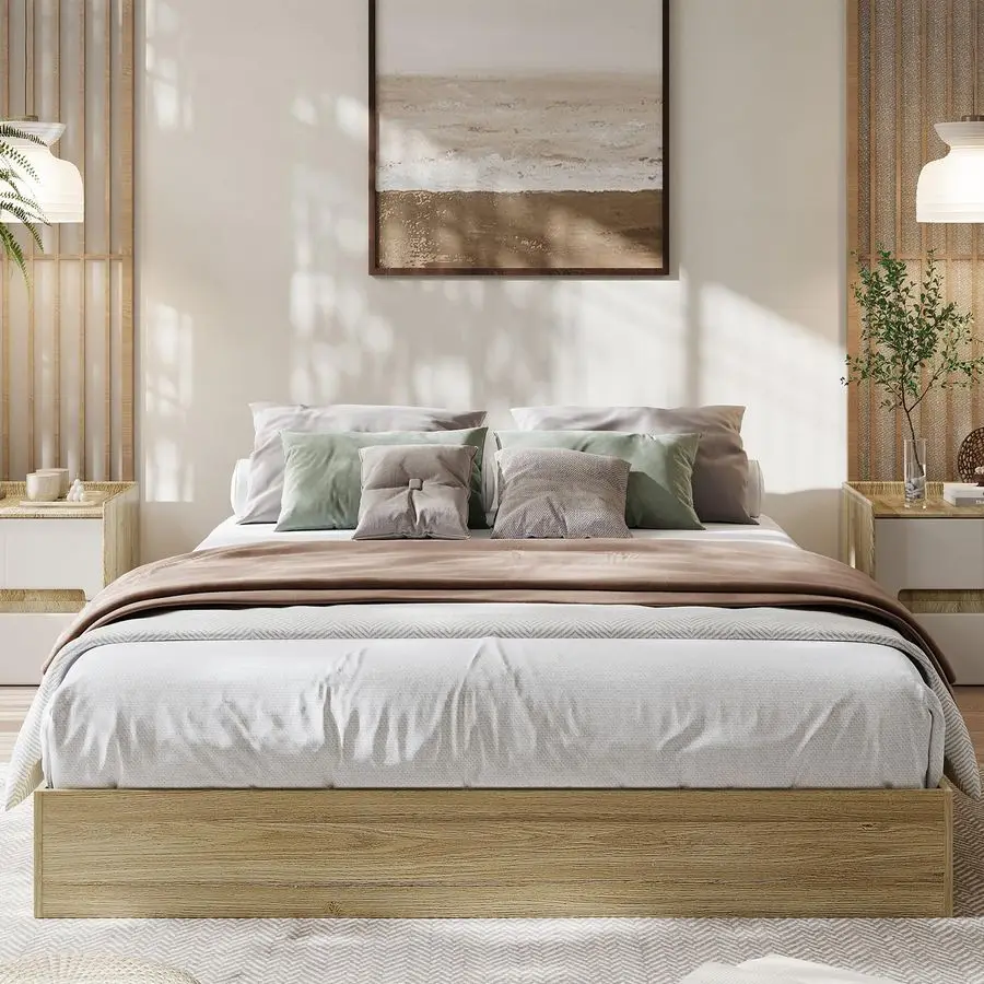 Modern Minimalist StyleThis wooden platform bed frame has a modern minimalist appearance with clean lines and no unnecessary embellishments, giving it a sleek and tidy appearance that easily blends with various modern bedroom styles. The texture of the wood create a natural and comfortable atmosphere, modern and warm.