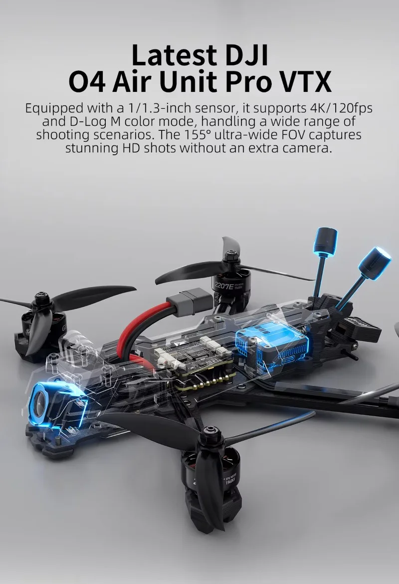 New aluminum lens components and shock-absorbing silicone reduce vibrations, while the sharp new side panels give it a bold, mech-inspired look. The DJI O4 Air Unit Pro's larger CMOS sensor enhances image detail and sensitivity, and the GEPRC-tuned PID settings ensure a smooth and immersive flight experience.