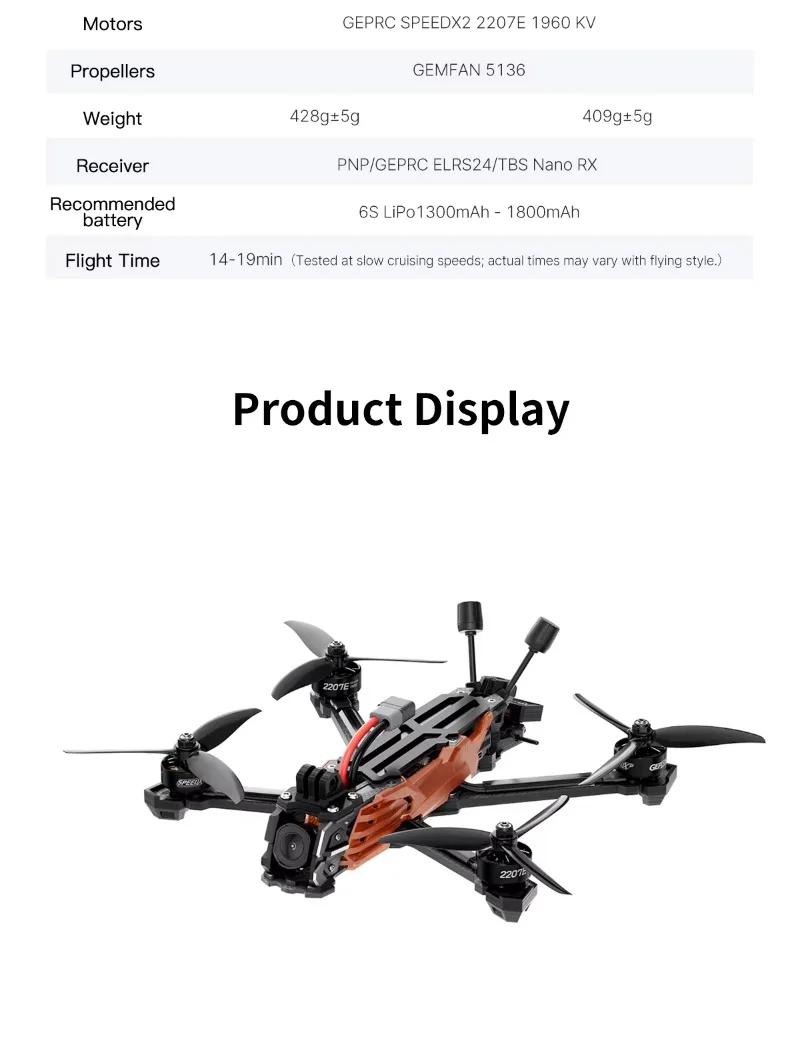 - 5-inch Motor: GEPRC SPEEDX2 2207E 1960 KV
