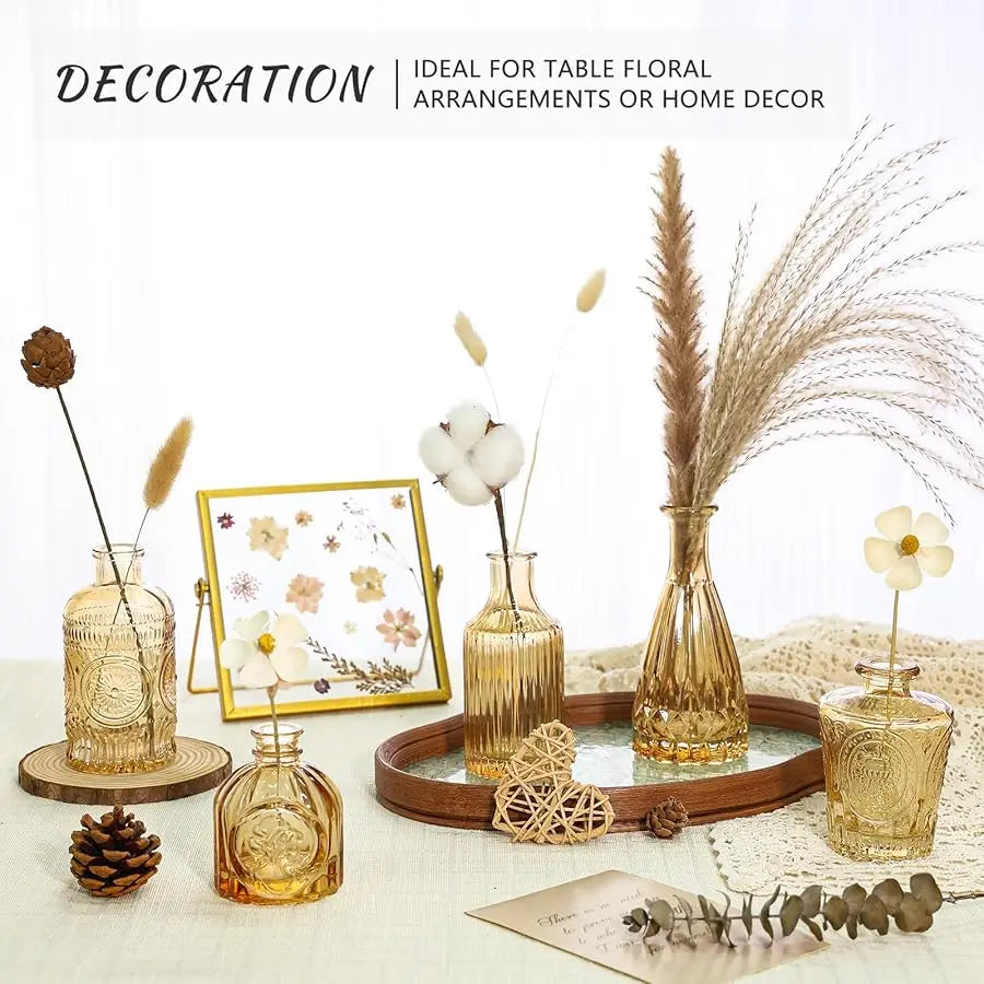 ELEGANT VINTAGE STYLE: This set includes 5 gold amber glass bud vases, each adorned with delicate etched patterns for added charm. These flower vases boast a classy vintage design, suitable for any occasion, from casual to formal. Spruce up your window sill, dining table, or wedding reception with these beautiful vintage décor vases, creating an elegant centerpiece that will captivate all who see them.