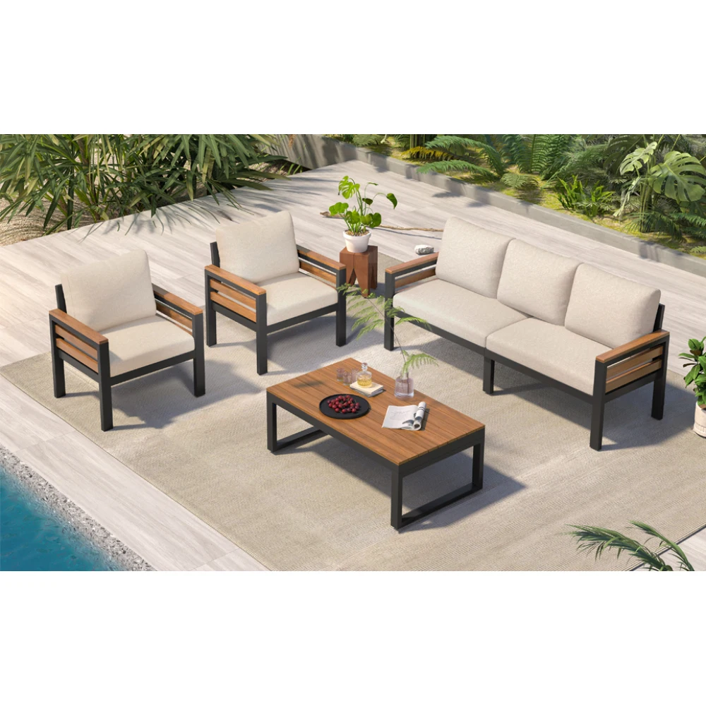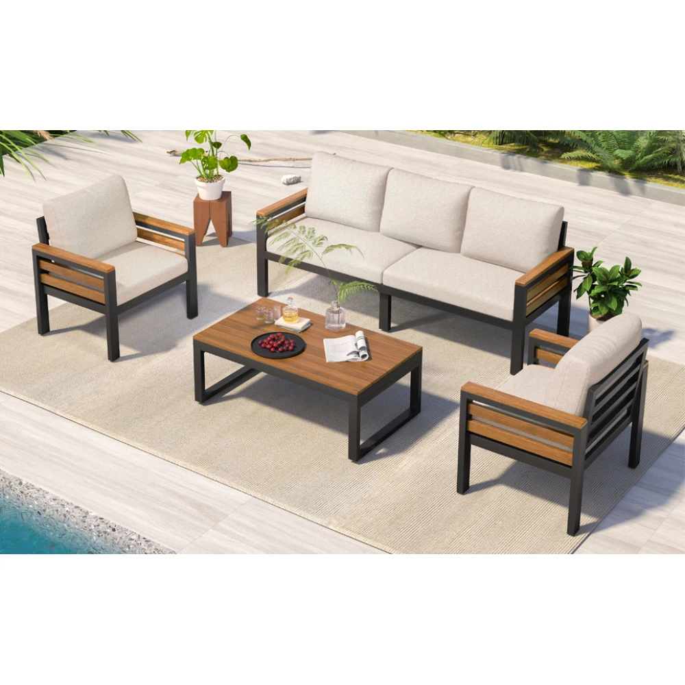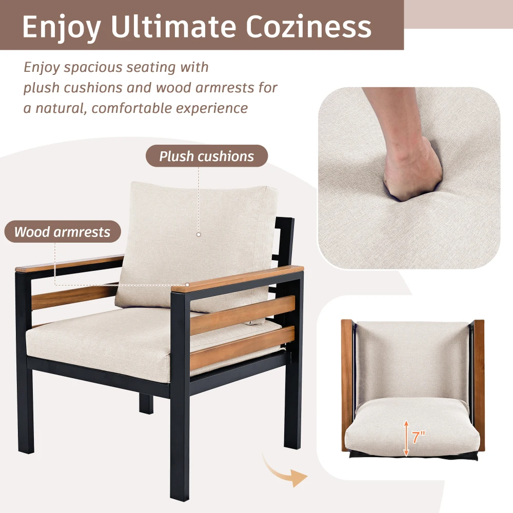 GO 4-Piece Outdoor Furniture Sofa Set for 5 People with Acacia Wood Armrests Patio Conversation Set with Removable Cushion