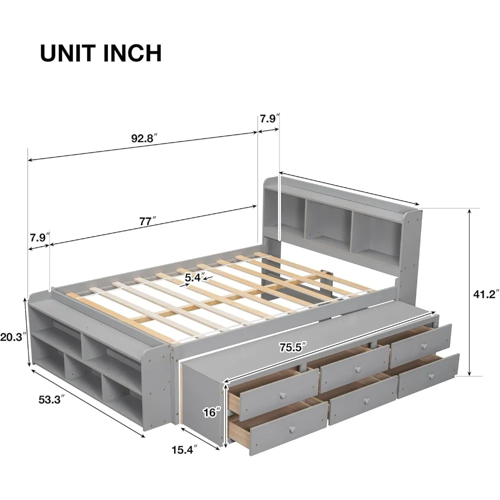 This product features a multifunctional storage headboard that includes a bookshelf with separate compartments for organizing and storing books, toys, lamps, and other accessories. This design eliminates the need for additional bedside cabinets, making it an ideal solution for small spaces and transforming cluttered areas into neat and appealing bedrooms. The bed frame is reinforced with a central support slat and 10 slats, ensuring user safety and stability. Crafted from premium pine wood, the storage bed offers long-lasting sturdiness and durability. The bed also includes a drawer storage combination, which adds a practical element to any living room or bedroom. The six drawers glide smoothly, providing ample and discreet storage space for personal belongings, helping to maintain a clutter-free environment. The bed-end storage case has five compartments, keeping the room organized and maximizing space-saving potential. This storage case can also function as a tea/coffee table, bookcase, and additional storage space. Assembly is simple with a clear manual and provided hardware. The product is delivered in three packages, and customer support is available for any assembly assistance or inquiries. The dimensions of the bed are 92.8 inches in length, 57.5 inches in width, and 41.2 inches in height.