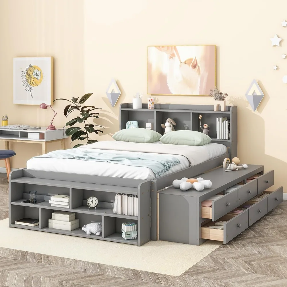 Gray Full Size Captain's Bed with Storage and Bookcase Headboard, Bed Frame for Bedroom, No Box Spring Needed