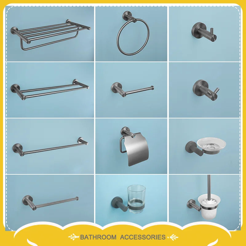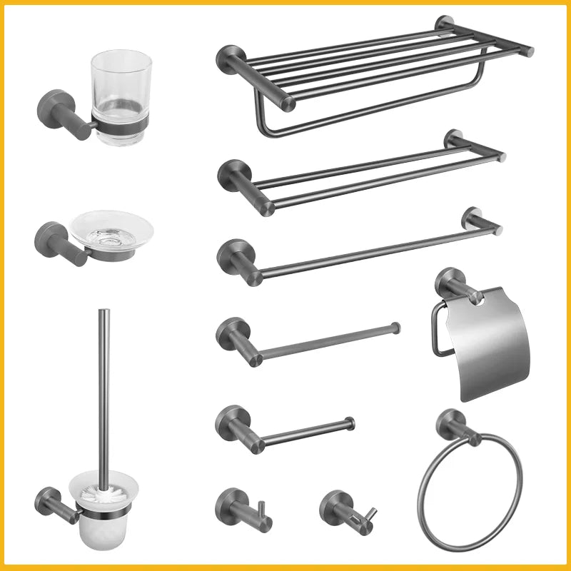 Grey Bathroom Hardware Set Accessories Kit Stainless Steel Round Wall Rack Hand Bar Toilet Roll Paper Holder Robe Towel Hook