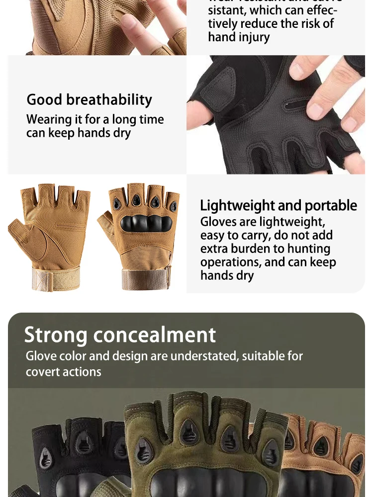 • Tactical Design :These gloves are designed for outdoor hunting, offering a tactical edge with their half-finger design.