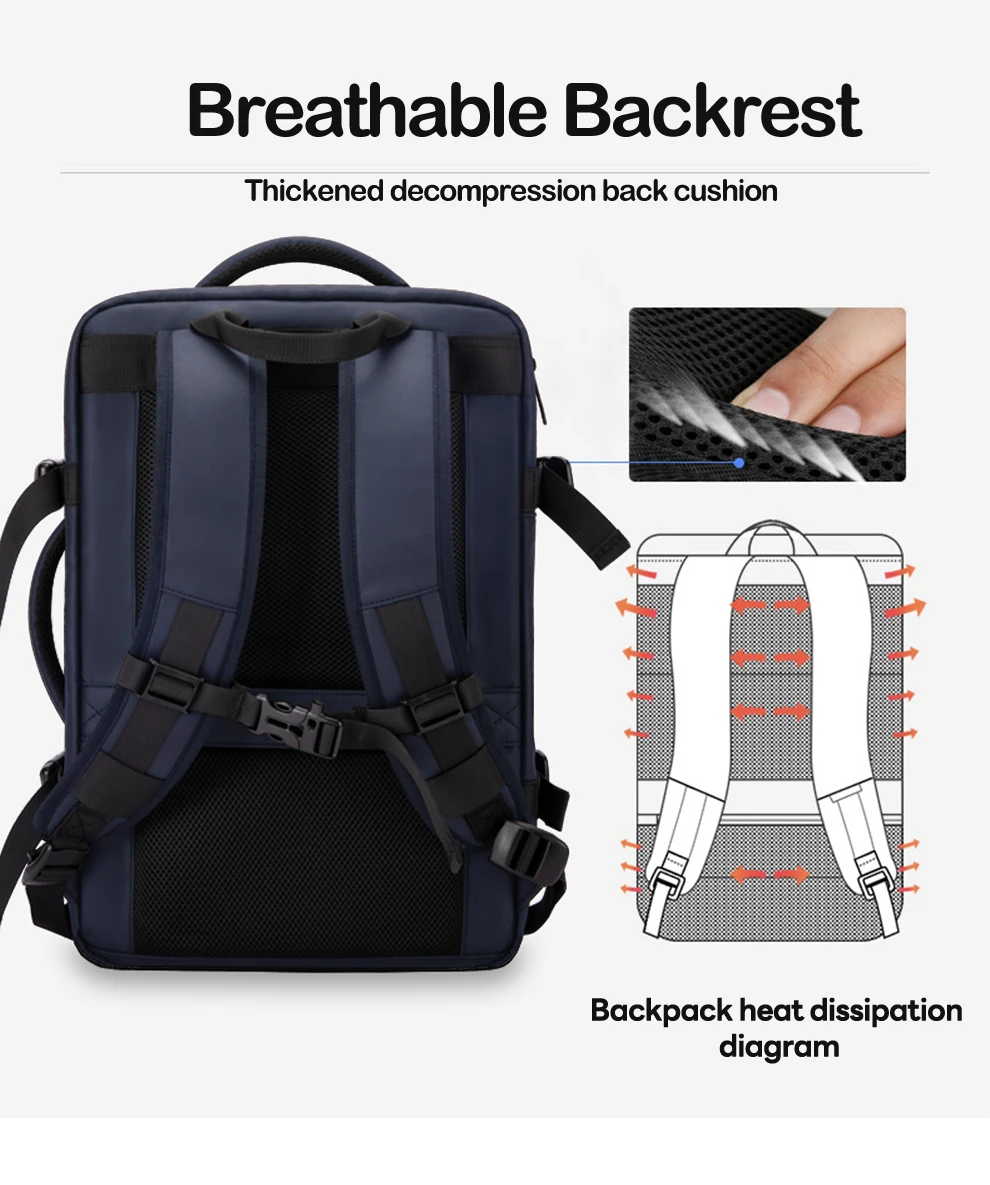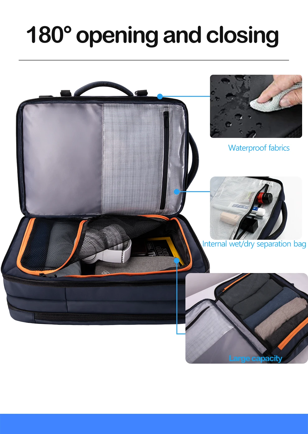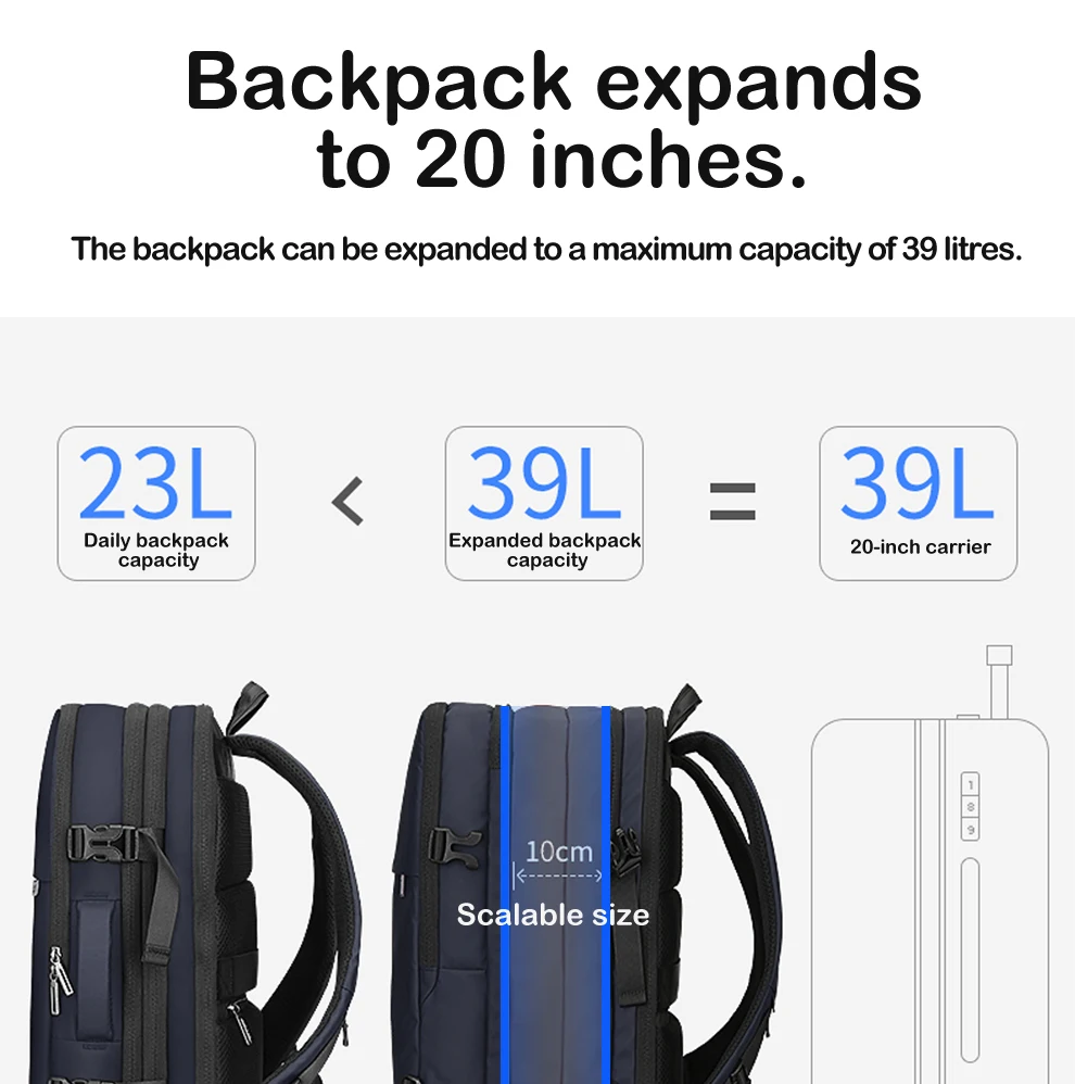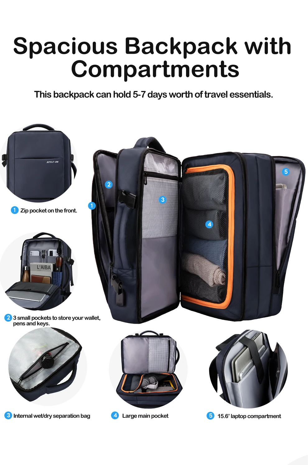 The main compartment of travel backpack can open 180°, which equivalent to a 20-inch suitcase, making it easy to access to it. You can also expand the volume when it is required for your travel or daily use. The laptop backpack has a independent computer compartment for 15.6 inch laptop to protect your electronics better.