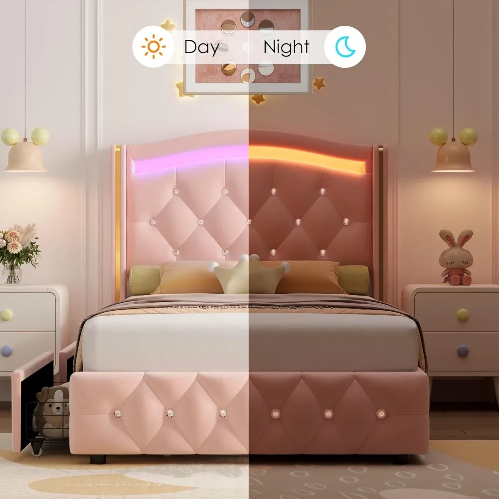- IDEAL BED FOR ALL PRINCESSES: This elegant bed merges style and functionality, featuring luxurious crystal tufting that sparkles in the light. The soft velvet fabric invites coziness, while its built-in LED strips, which are customizable in colors and modes, create a magical atmosphere for any mood. It seamlessly fits various decor styles, inspiring relaxation and creativity, making it an enchanting centerpiece for any girl's room