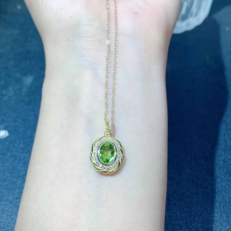 Hot Sale 925 Silver Jewelry Set with Gold Plated 6mm*8mm 2ct Natural Peridot Ring and Peridot Pendant with Silver Necklace