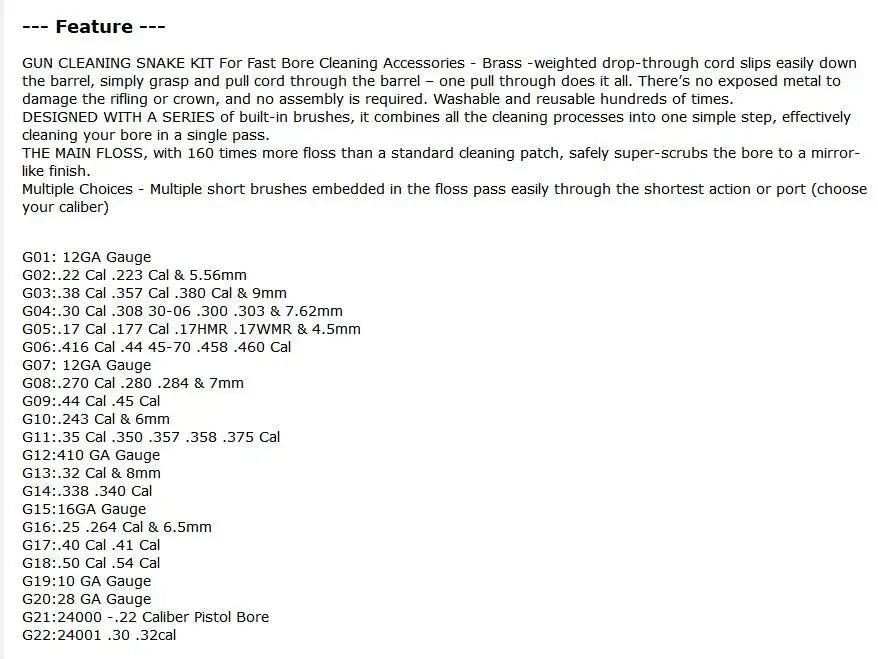 GUN CLEANING KIT For Fast Bore Cleaning Accessories - Brass -weighted drop-through cord slips easily down the barrel, simply grasp and pull cord through the barrel – one pull through does it all. There's no exposed metal to damage the rifling or crown, and no assembly is required. Washable and reusable hundreds of times.