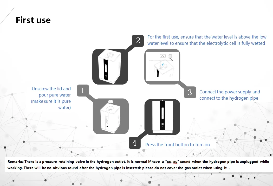 We have overcome the technical bottleneck of hydrogen production. In the process of hydrogen production, we need not to dispose a humidification bottle, avoiding the problems that the machine sprays water into the nostrils, bacterium grow in the humidification bottle, and the hydrogen purity reduces.