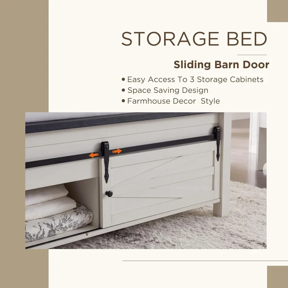 - Sliding Barn Door Storage Cabinets: The king bed frame with storage at the footboard can store sheets, blankets or some regular reads. Sliding barn door space-saving design, Exposed delicate metal rails and classic farmhouse-style elements combine to give you the ultimate in beauty