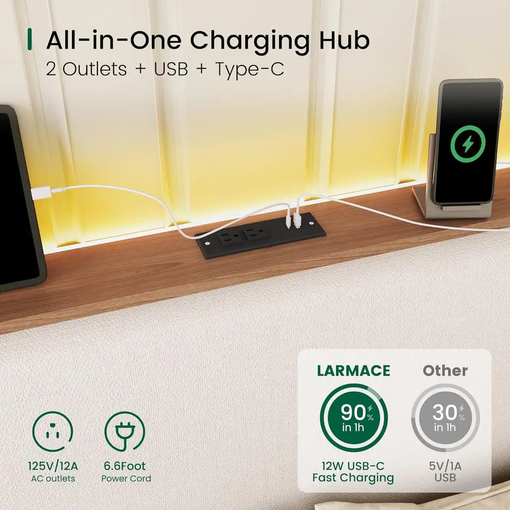 King Size Linen Bed Frame with LED Lights, Charging Station, and Storage Shelf - 51.2 Tall Wingback Headboard, No Box Spring Nee