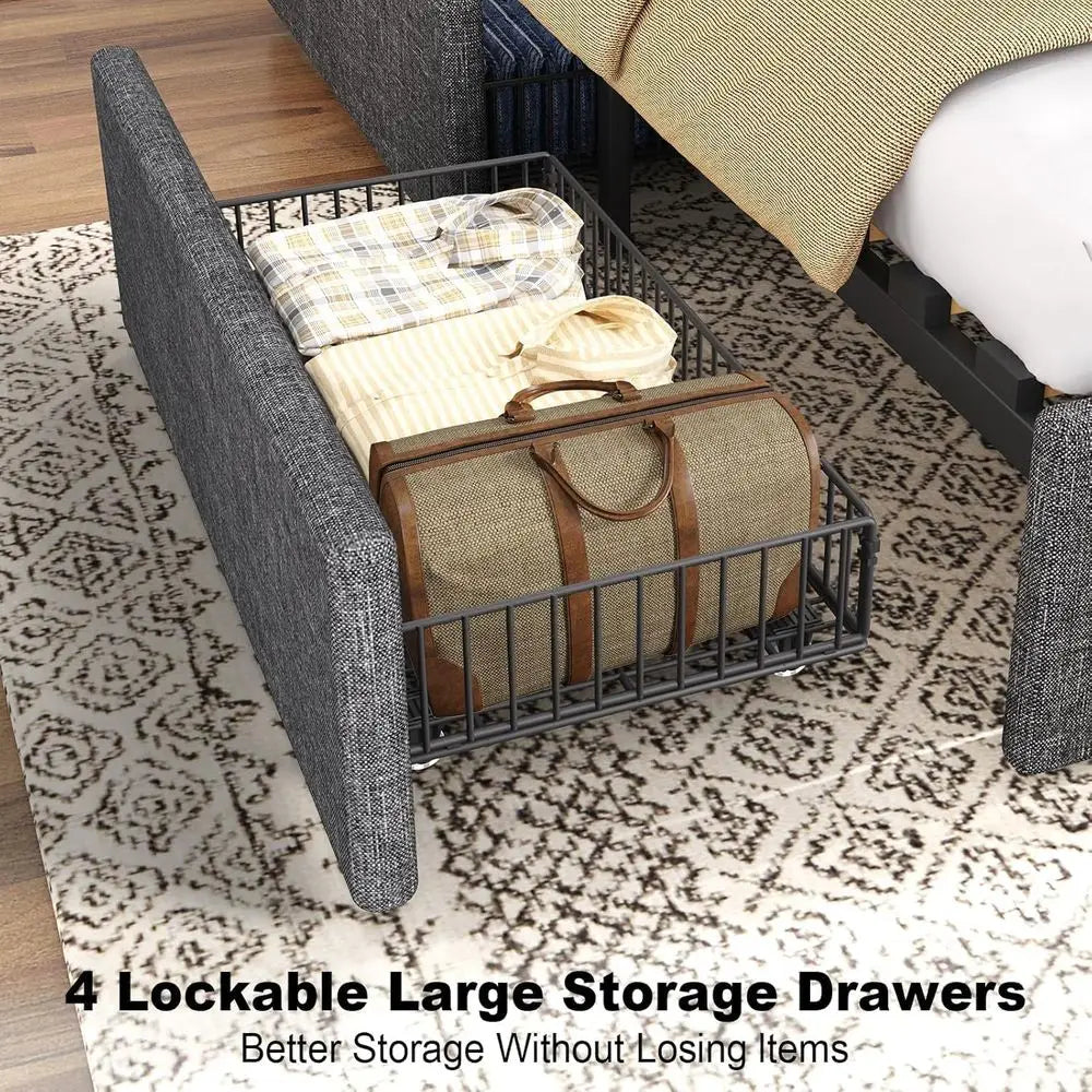 King Size Upholstered Bed Frame with Headboard, 4 Drawers, Charging Station, Dark Grey, Easy Assembly, No Box Spring Needed