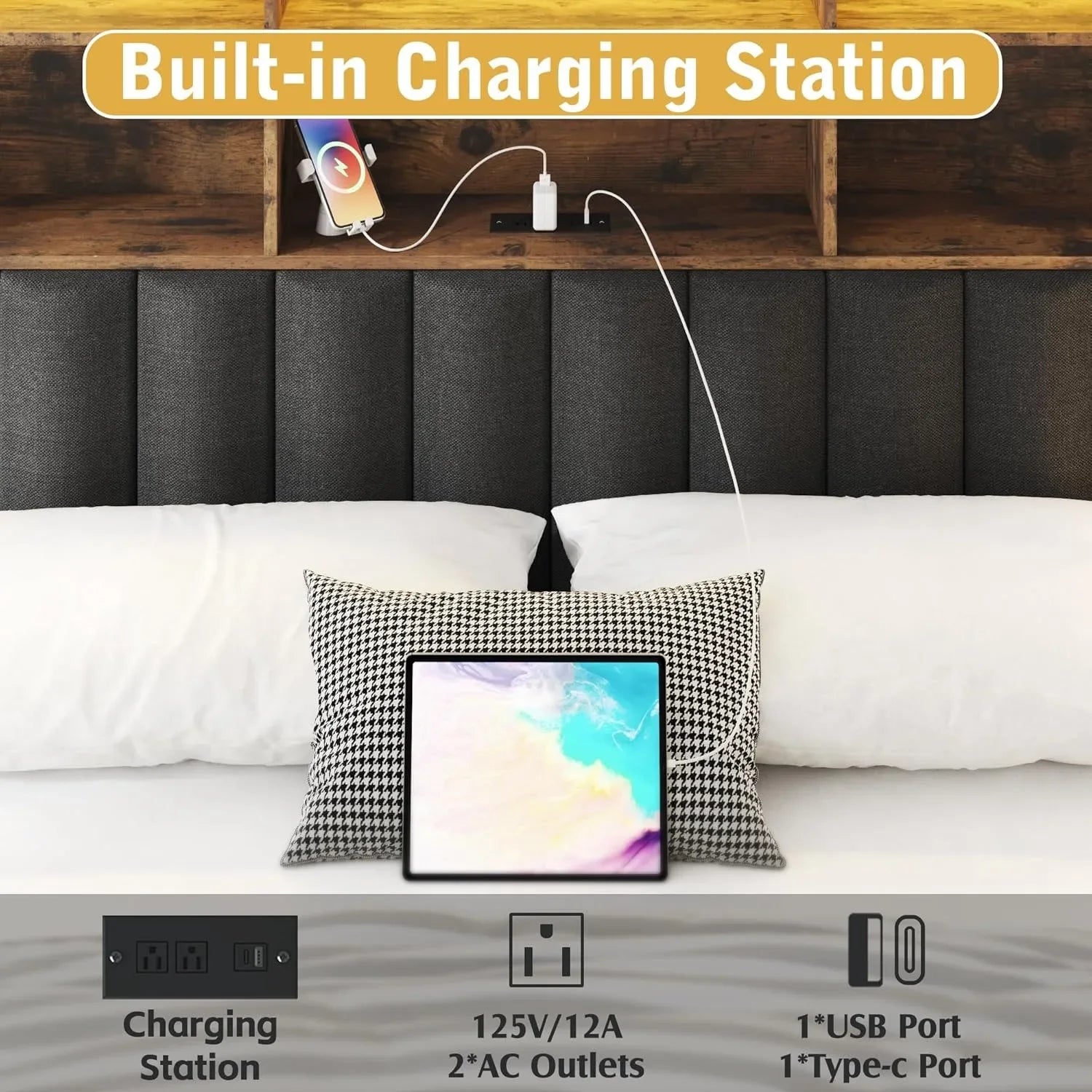 - 【Practical Built-in Charging Station】The storage headboard is equipped with a built-in charging station, including 2 AC Outlets, a USB port and a type-C port, allowing you to charge various electronic devices within easy reach.