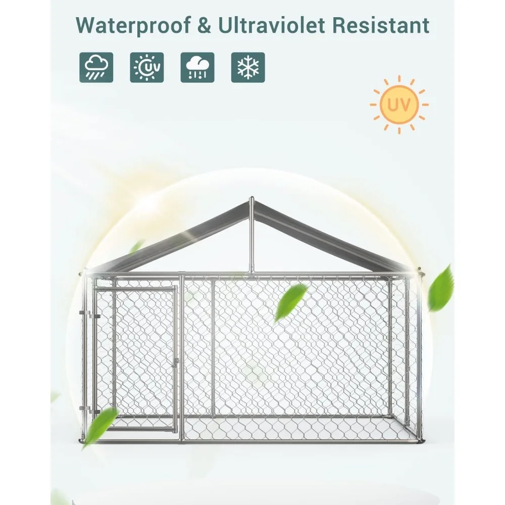 Large Outdoor Dog Kennel, Heavy Duty Galvanized Steel Dog Enclosure with Waterproof UV-Resistant Cover, Lockable Door Chain Link