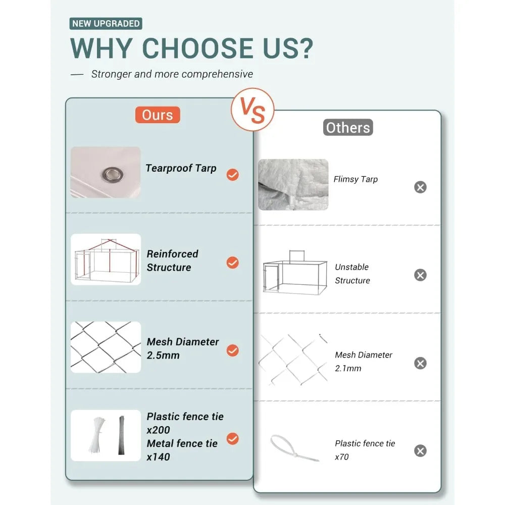 - Spacious and Secure Play Area: This outdoor dog kennel provides a large 118" L x 118" W x 71" H enclosure, giving your pets plenty of room to roam, play, and relax in a safe environment. Perfect for large dogs, cats, rabbits, and even chickens, it ensures your furry friends can enjoy their freedom while staying protected from unwanted intrusions