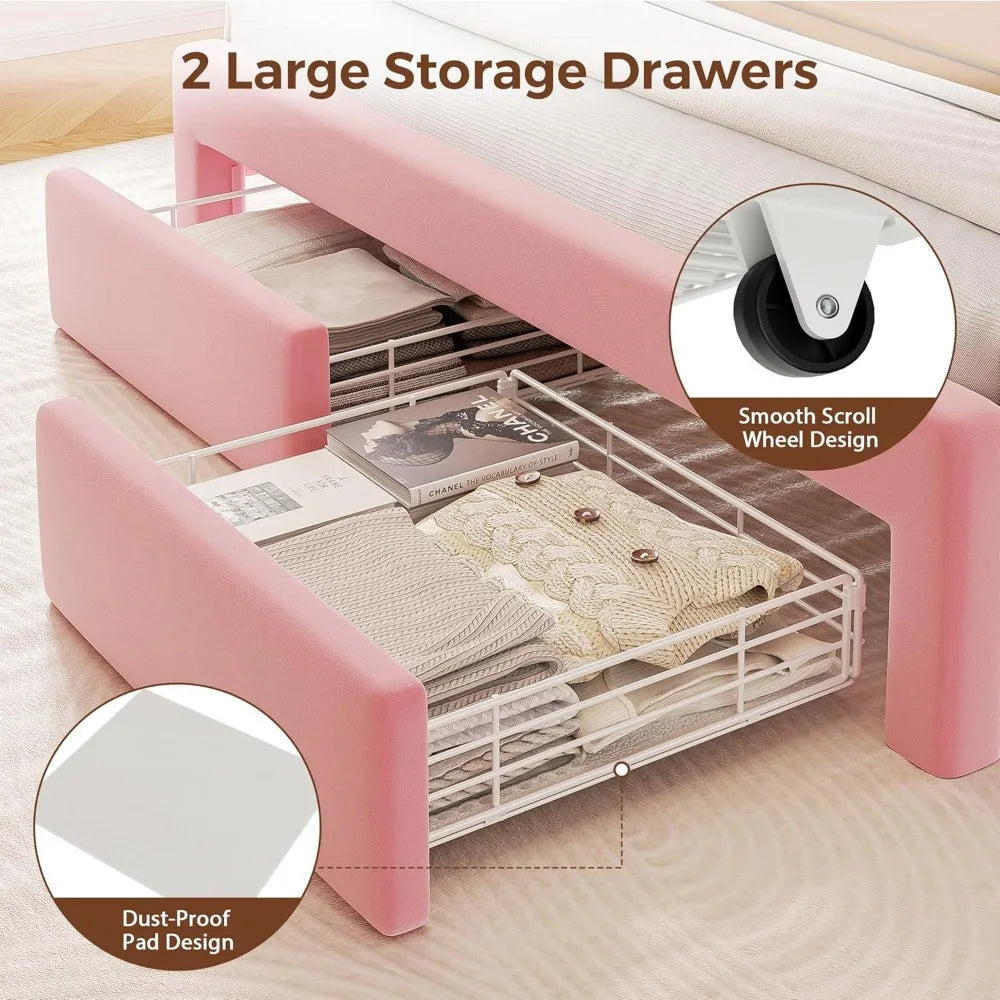 This full bed frame is a combination of comfort and practicality, featuring an open shelving display and a plush upholstered headboard. The shelves are ideal for displaying items like photo frames and books, while the top platform provides space for essentials such as phones and glasses. A hidden flip-top compartment behind the headboard offers discreet storage for personal items, helping to keep your bedroom organized. The bed is crafted in a pink hue with vertical channel-tufted detailing, exuding minimalist elegance and depth. The high-density velvet upholstery is soft and skin-friendly, radiating an elegant and lightly luxurious aesthetic that blends well with various modern home styles, adding warmth and sophistication to any bedroom. The bed frame includes an integrated charging station with 2 AC power outlets, 2 USB-A ports, and 1 USB-C port, allowing you to charge multiple devices in one place without the need for extra power strips. Additionally, it features built-in adjustable RGB LED lights with 16 million colors, over 20 lighting effects, and dynamic modes, controlled via app or remote, to create the desired ambiance in your bedroom. Equipped with 2 spacious and smooth-gliding silent drawers at the foot of the bed, this design maximizes space utilization, providing ample storage for off-season clothing, spare bedding, or other household items, and helping maintain a clutter-free bedroom. The drawers' bottom lining prevents dust, making this bed ideal for small spaces or households that prioritize efficient organization. The headboard is padded with thick, high-resilience foam for superior comfort and support while sitting up. The fully upholstered bed frame includes padded edges to prevent bumps and injuries, making it safe for families with children or elderly members. Supported by a reinforced solid wood frame and thick, quiet legs, the bed ensures exceptional stability, guaranteeing a peaceful and restful sleep every night. Assembly of this full bed frame is user-friendly, with every part clearly labeled and pre-drilled holes ensuring perfect alignment. A detailed instruction manual is included, and essential tools such as a hex key are provided in the box, making the assembly process quick and easy.