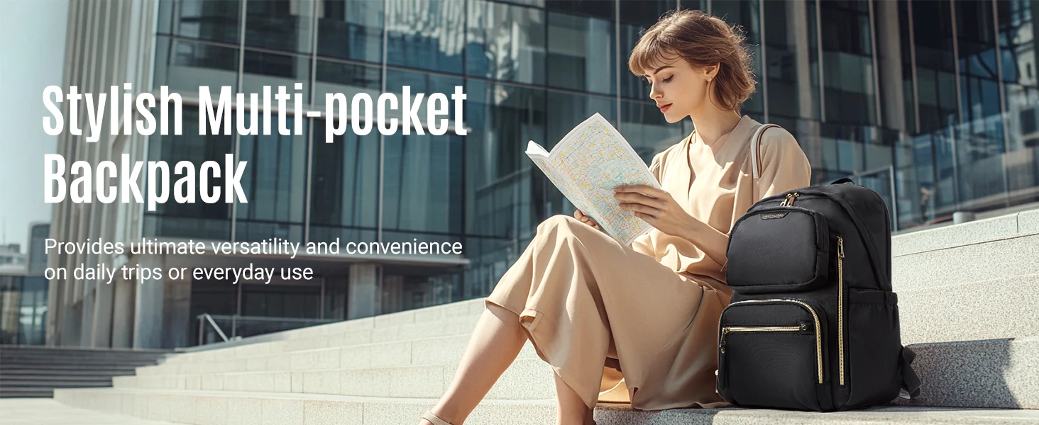 This women's laptop backpack features a dedicated 15.6" laptop compartment, 5 internal pockets, and 4 external pockets for organization. It has EVA foam padding for protection and secure zippers. The travel-friendly design includes a luggage strap and meets airline carry-on requirements. Comfortable with breathable padding and thick shoulder straps, it's perfect for long commutes. Stylish and versatile, it suits work, travel, and daily use. Dimensions: 16.7"x11.6"x7.6"; 23L capacity; 1.54 lbs.