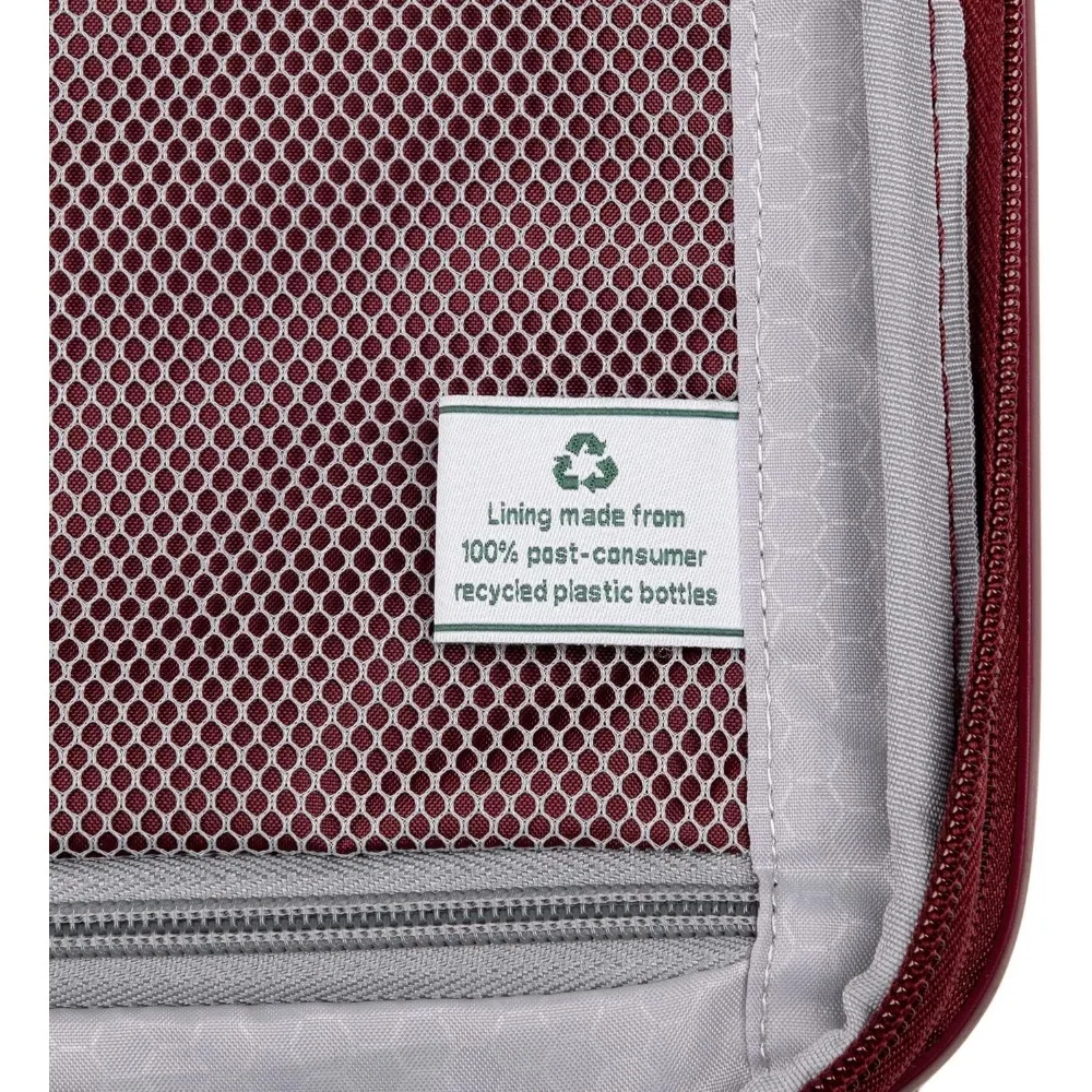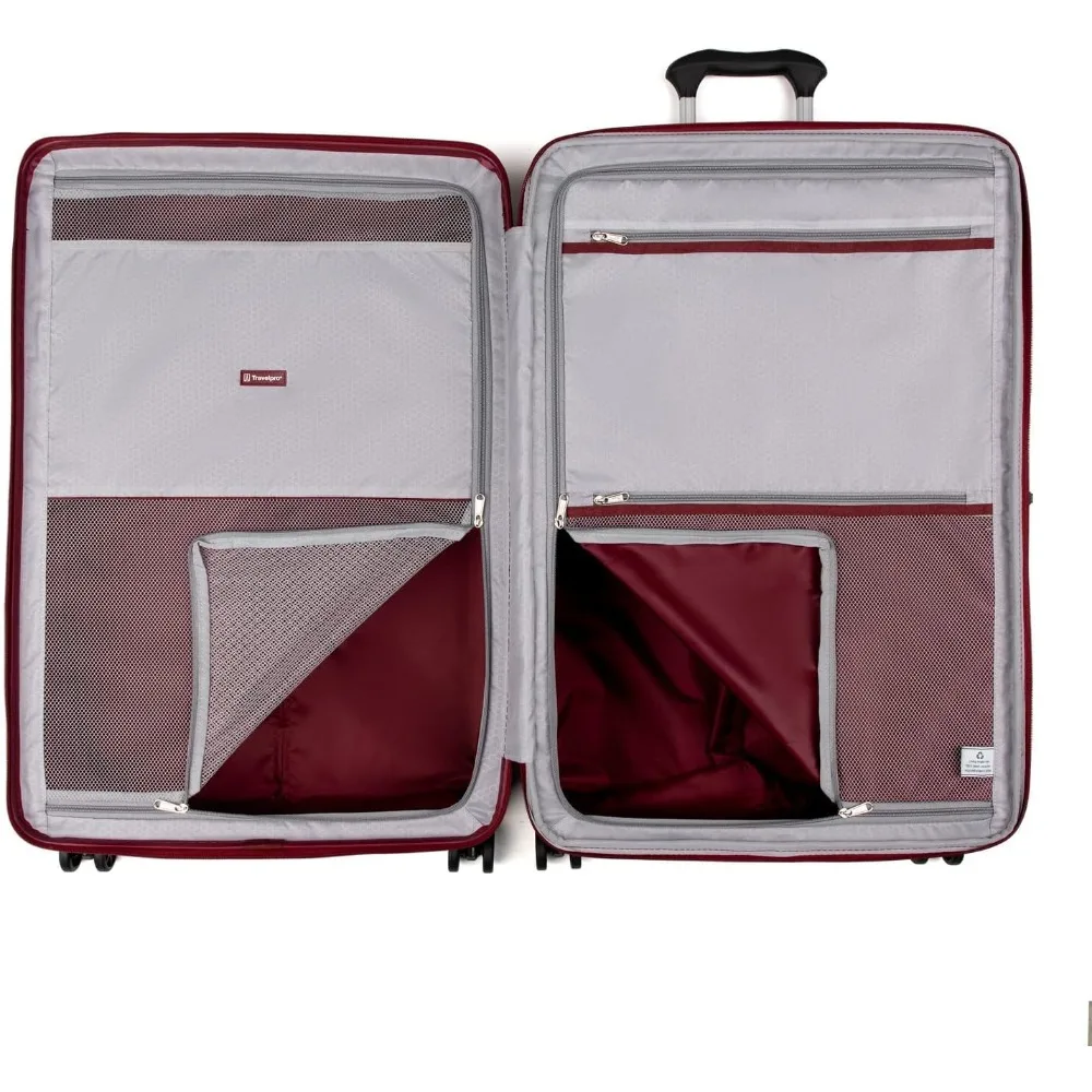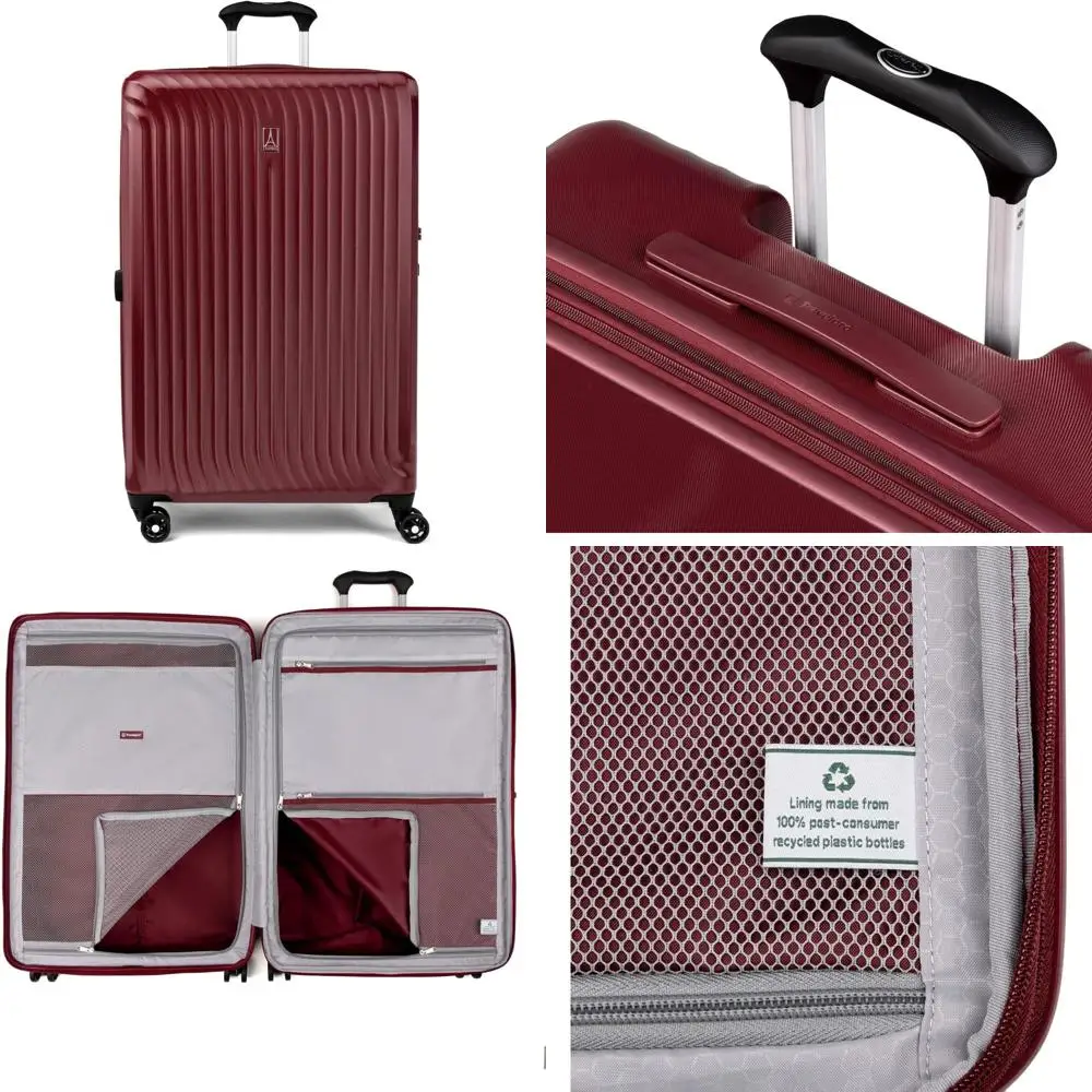 Here is a rewritten product description based on the provided information: This large suitcase adheres to the standard check-in size limits for most domestic airlines, with a total linear measurement of 62 inches. It features 8 spinner wheels that allow for easy 360-degree rotation, ensuring smooth movement in any direction. The hard-shell case has low-profile top and side handles, along with a bottom grip, offering various carrying options. The main compartment can expand by 2 inches to accommodate additional items when needed. The hardside luggage is made from lightweight, 100% polycarbonate material designed for durability and flexibility, with an outer finish that helps minimize visible scratches and scuffs. It includes a built-in lock that can be accessed by TSA for inspections, with a default code of 0-0-0. The interior of the suitcase is equipped with zippered divider panels and an accessory pocket to keep belongings organized and secure. The lining is made from H20 guard material, which is crafted from 100% recycled plastic bottles, contributing to environmental sustainability. The overall dimensions of the luggage, including wheels and handles, are 30.5 inches in height, 19.5 inches in width, and 12 inches in depth. The case dimensions are 27.5 inches in height, 18.5 inches in width, and 12 inches in depth, with a weight of 10.1 pounds. This durable hard case luggage comes with a limited lifetime warranty and a companion promise that covers the cost of repair for damage caused by airlines or other common carriers for one year, applicable after registration and when purchased new.