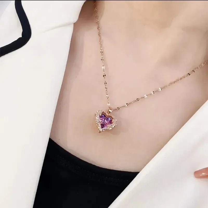 Luxury Colorful Crystal Ocean Heart Pendant Necklace For Women Korean Fashion Stainless Steel Neck Chain Female Wedding Jewelry