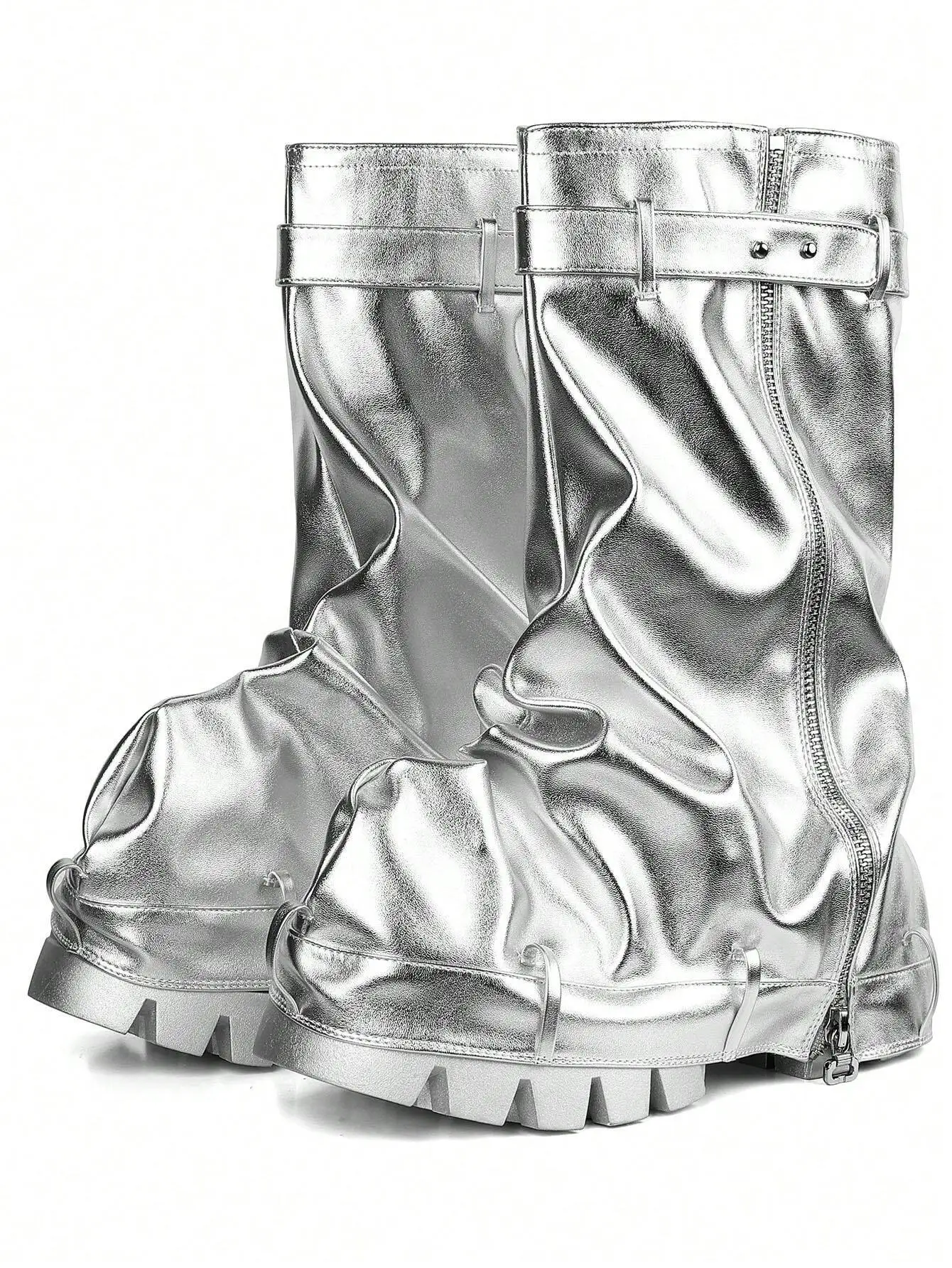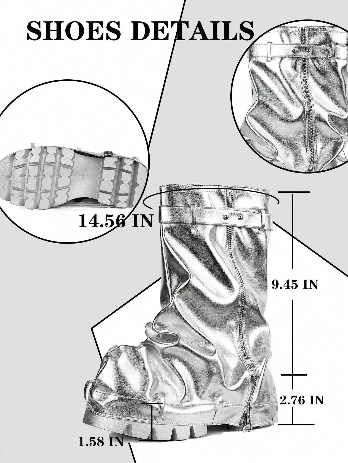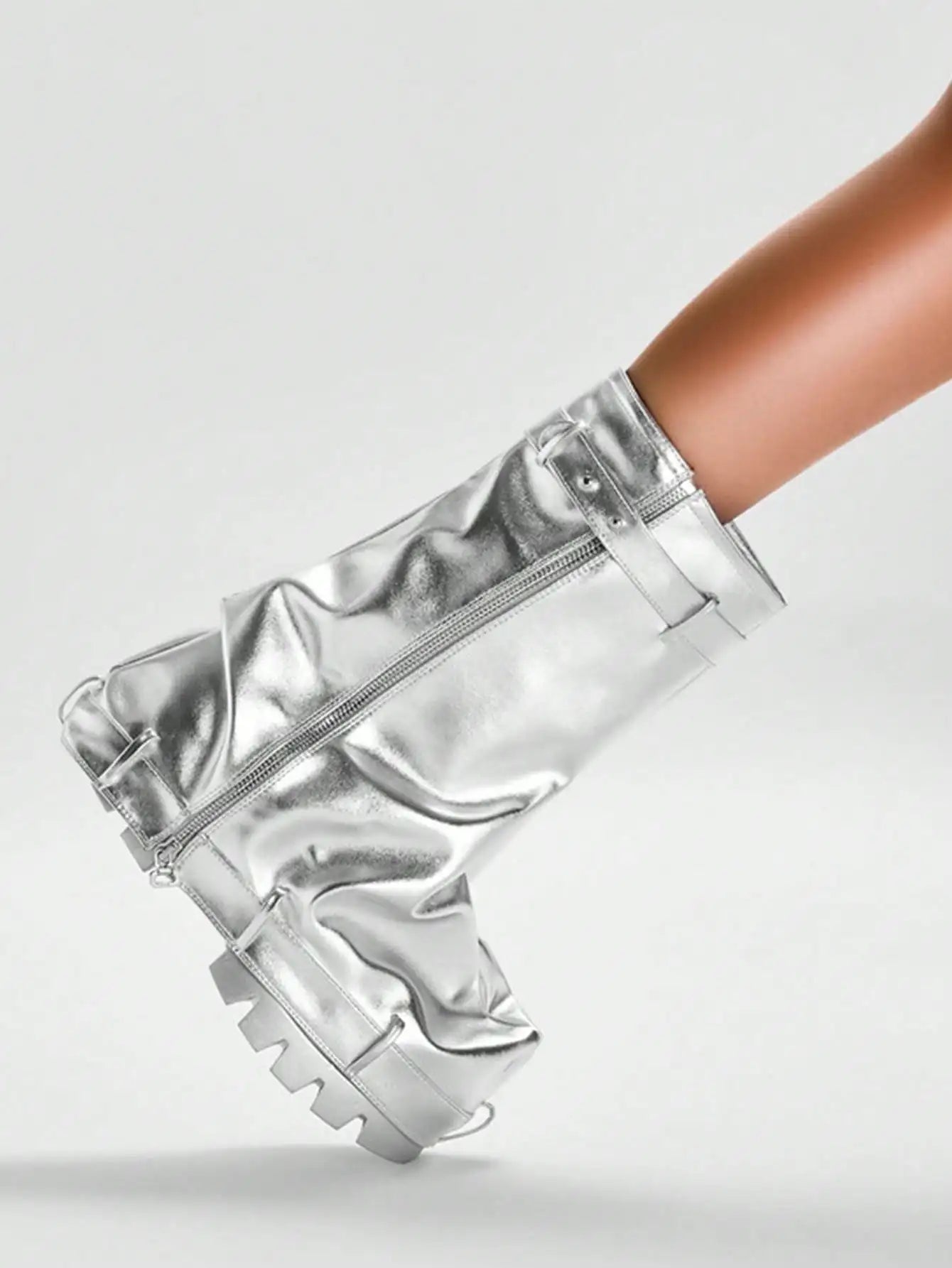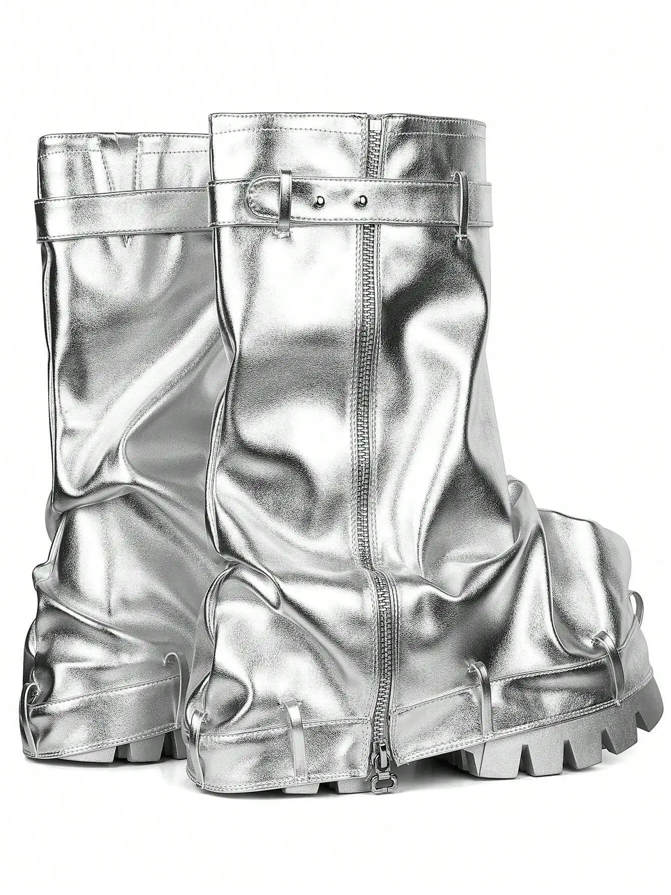 Metallic Fashion Women Fold Over Boots Chunky High Heels Mid Calf Platform Punk Gothic Fashion Motorcycle Shoes Woman