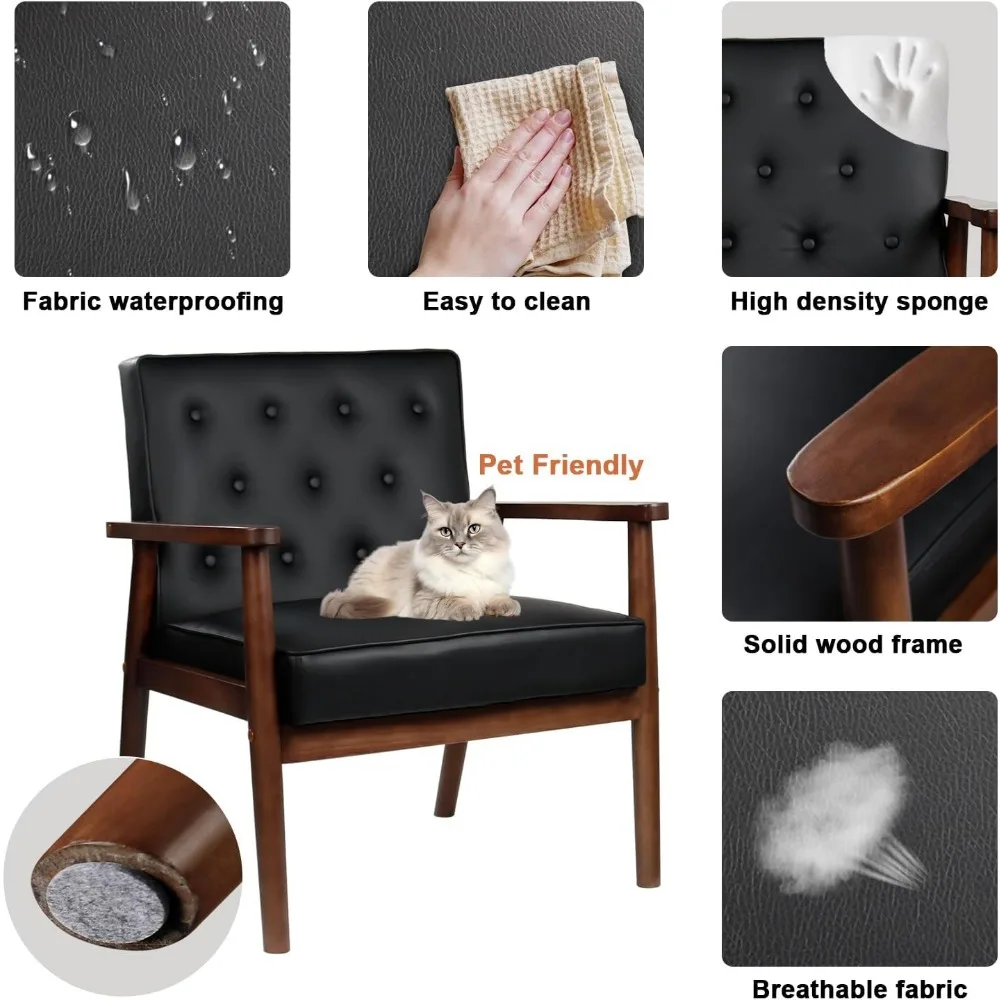 Mid Century Modern Chair, PU Leather Accent Chair Set of 2 with Wood Arms, Living Room Chairs, Reading Armchair for Bedroom, Wa