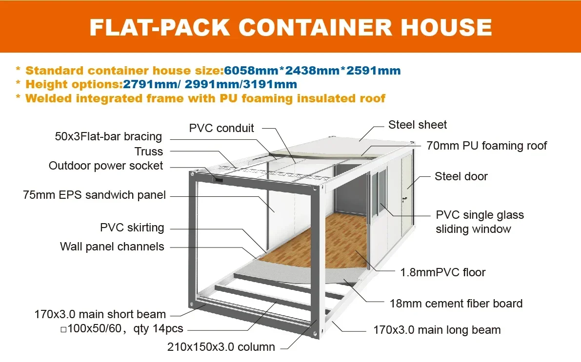 steel struction chassis + 18mm thickness cement-fiber board + 2mm thickness PVC floor sheet (glass wool insulation for optional)