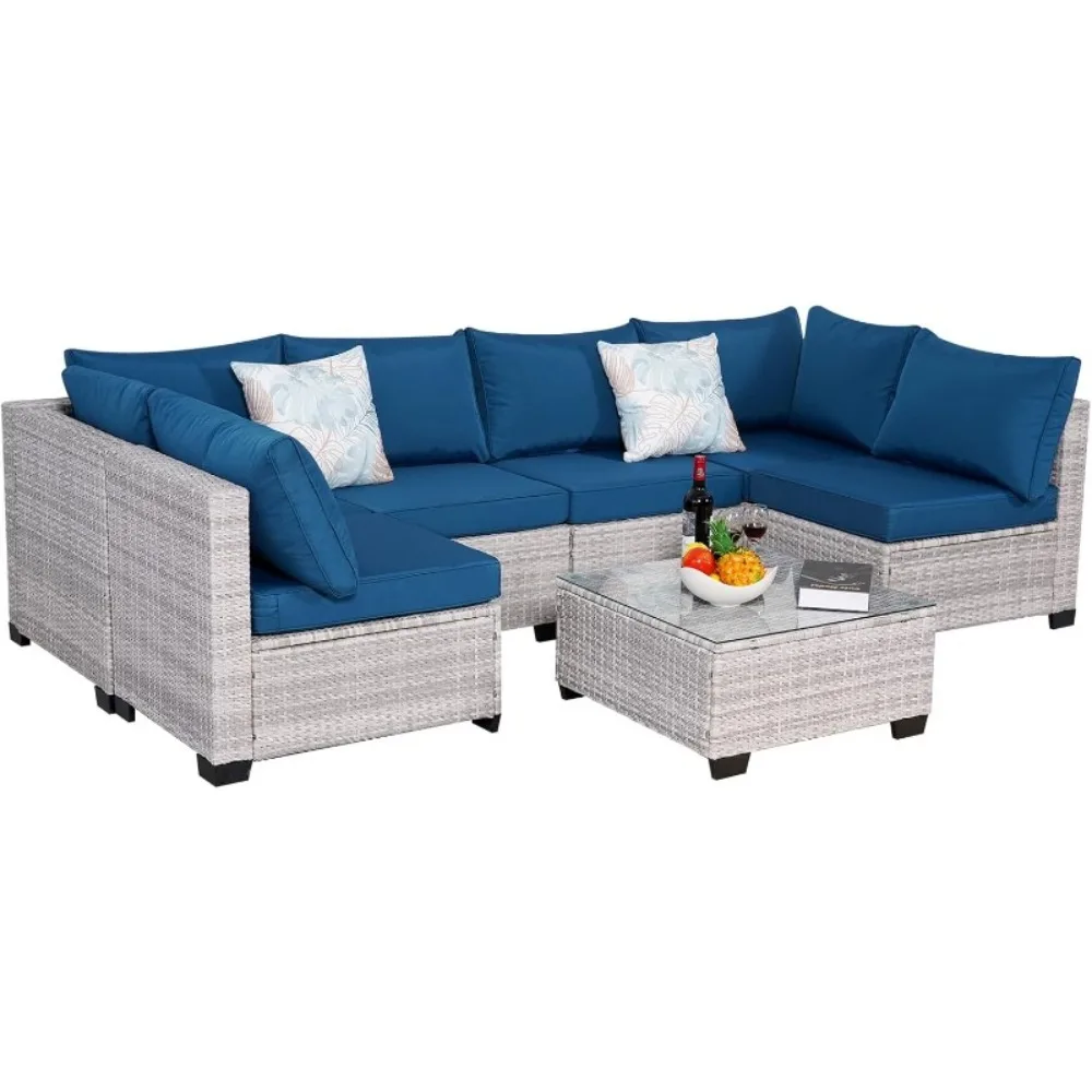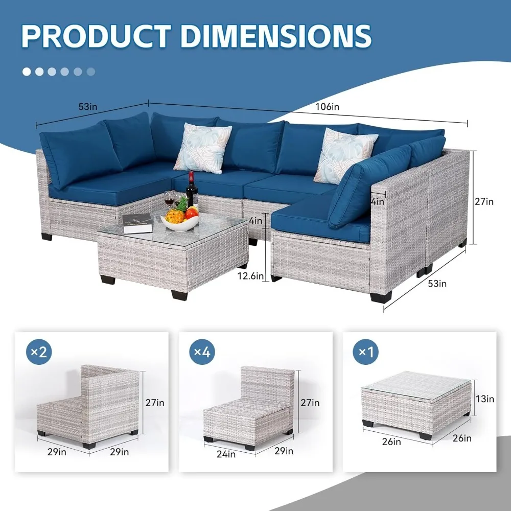 - 7-Piece Modern Patio Furniture - This patio furniture set contains 4 single sofas(24*29*27), 2 corner sofa(29*29*27), 1 coffee table(26*26*13), and detachable seat cushions. The patio table and Chairs can easily meet your needs to chat with your family or friends on the porch, balcony, or other outdoor space