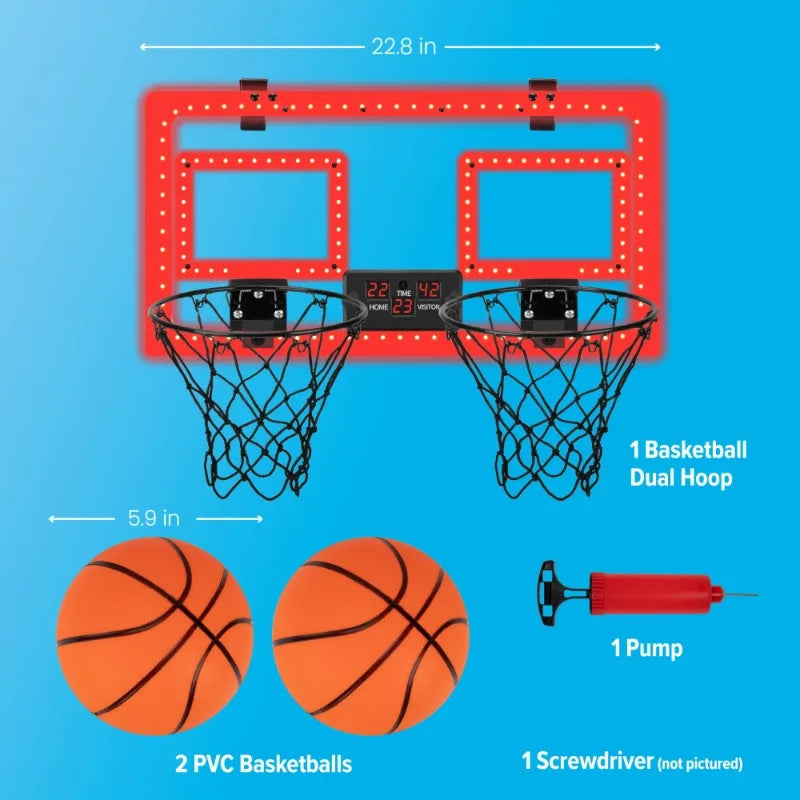 - COMPETITIVE FUN: The battery-powered dual hoop design and 23-inch backboard allow for 2-player action!