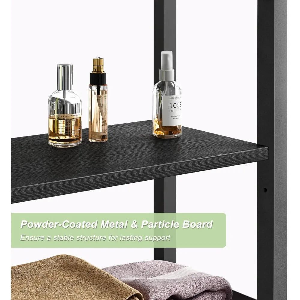- [Utility Design] Our over the toilet storage shelf features three open shelves and 1 storage basket, along with 3 removable hooks and a toilet paper holder, providing ample storage space. The compartment below the basket helps organize your toilet, washing machine, dirty clothes cart, and other large items.