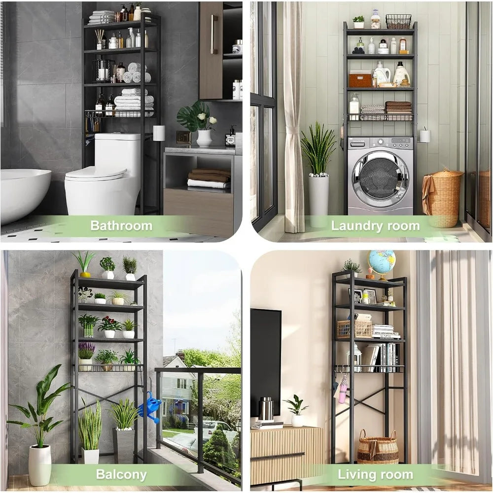 - [Multipurpose Storage Rack] Ideal for small spaces, our over-the-toilet storage rack saves space and maximizes storage capacity. Perfect for bathrooms, living rooms, kitchens, entry halls, laundry rooms, balconies, porches, dormitories, hotels, and offices. It can be used as a storage rack, kitchen shelf, plant shelf, or laundry organizer, providing the perfect solution for small bathrooms or apartments.