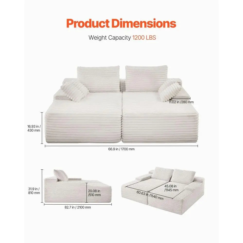 - Combined Sofa (without cushions): 82.7 x 66.9 x 23.2 in / 2100 x 1700 x 590 mm,Single Sofa (without cushions): 82.7 x 33.5 x 23.2 in / 2100 x 850 x 590 mm,Weight Capacity: 1200 lb,Single Sofa (with cushions): 82.7 x 33.5 x 31.9 in / 2100 x 850 x 810 mm,Combined Sofa (with cushions): 82.7 x 66.9 x 31.9 in / 2100 x 1700 x 810 mm,Color: Beige,Item Model Number: 247055,Fabric: Corduroy (3.5 CM),Net Weight: 66.14 lb / 30 kg (including all accessories)