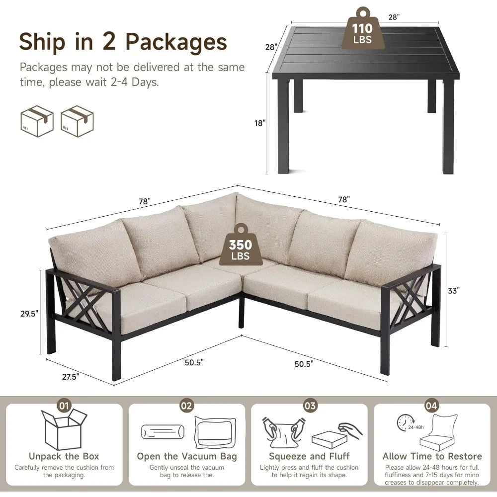 - 【Dimensions】 Even a small balcony can become a luxurious lounge! L-shaped couch: 78" x 27.5" x 29.5", Metal Coffee Table: 28" x 28" x 18". Outdoor seating furniture sets safely holds up to 350 lbs—fit 6 adults without any elbow wars! Heads up: The L-shaped sectional couch is delivered with 2 boxes, you may not get all boxes at the same time