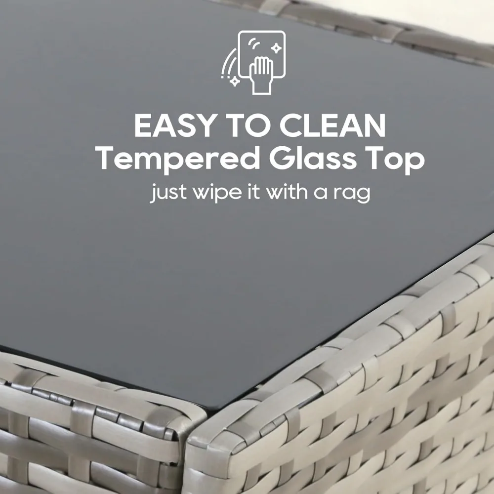- TEMPERED GLASS TOP TABLE:The wicker coffee table in this 4 piece patio furniture set is equipped with sturdy removable tempered glass that is easy to clean and requires only a light wipe with a rag to remove stains. you can also put drinks, food, books and other decorations on it