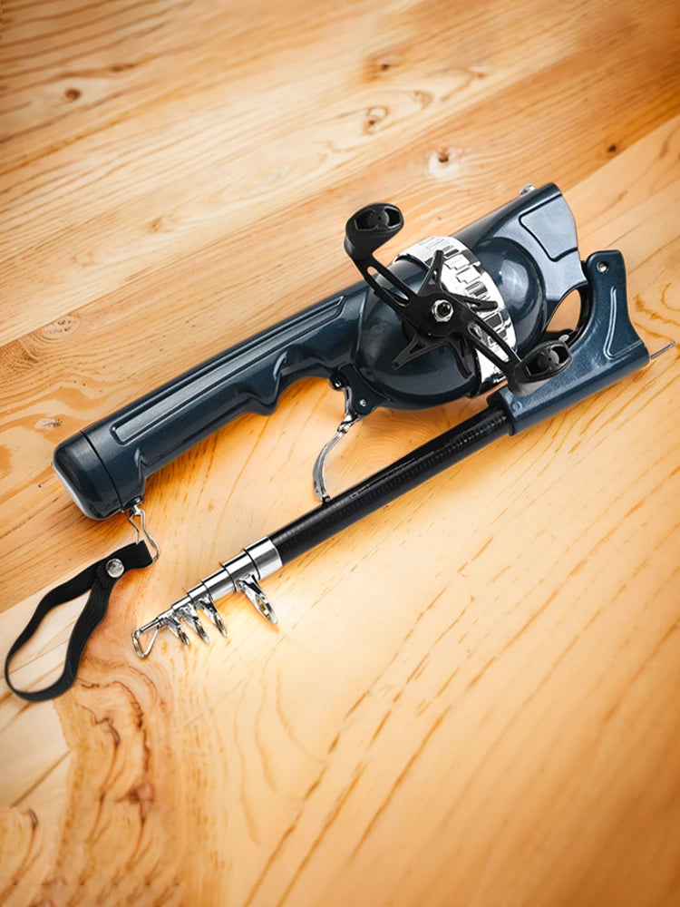 3. Enhanced Functionality: The unique extended handle design of this travel rod provides additional functionality. By simply pulling down the black strap beneath the handle, users can access extra space for storing hooks, baits, and small fishing accessories. Retracting the handle is equally effortless, requiring only a pull of the black strap.