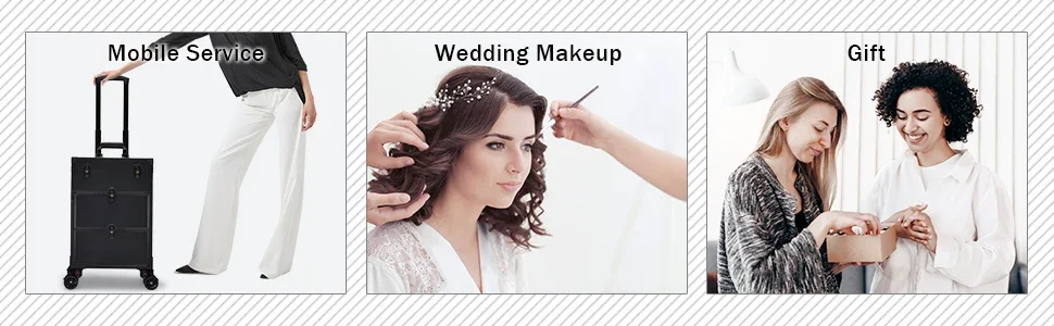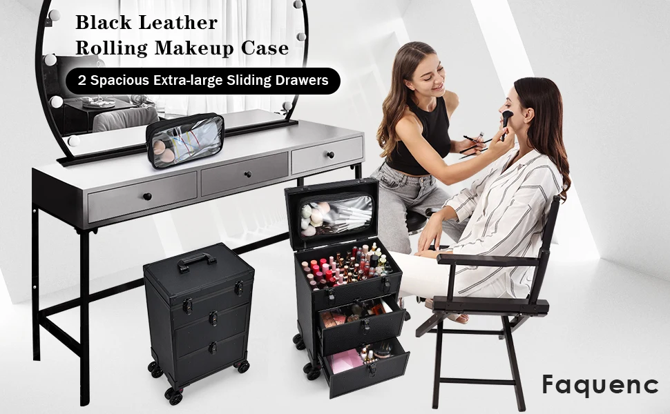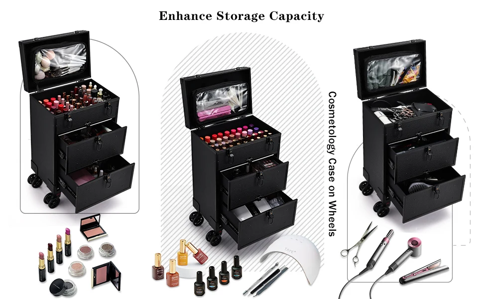 Professional 3 in 1 Rolling Makeup Case on Wheels 2 Large Drawer Nail Trolley Traveling Cosmetic Train Case with Makeup Pouch