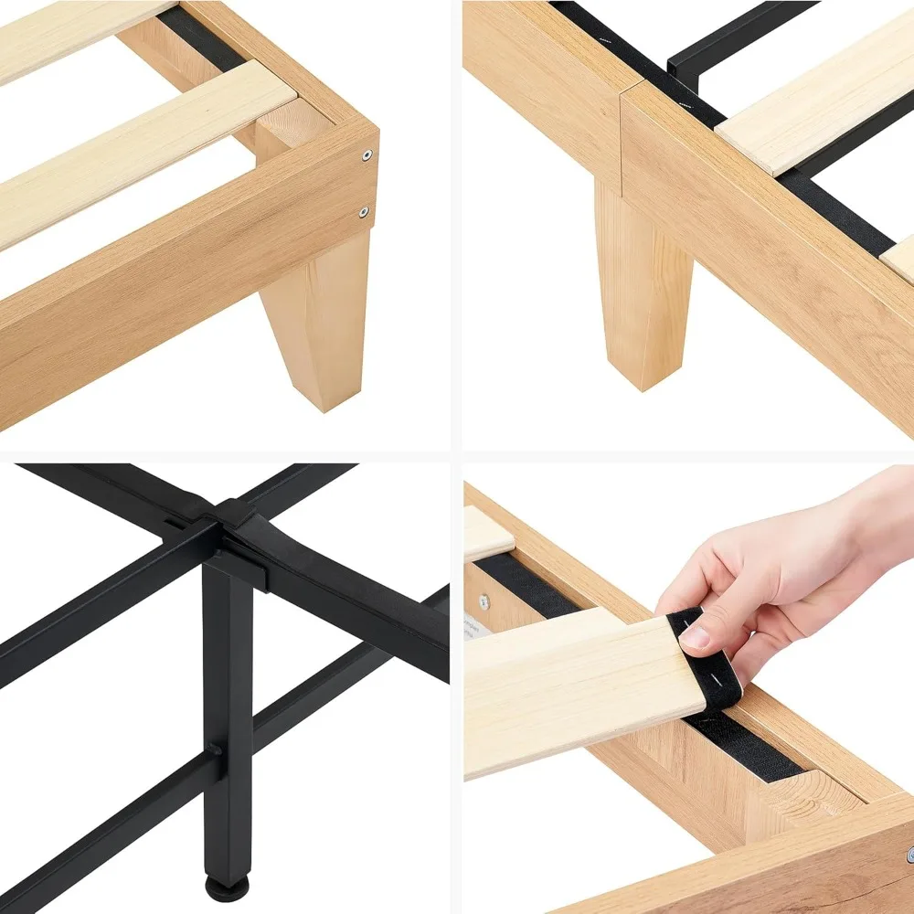 This rattan headboard is crafted with two square panels of natural rattan, offering a cool and comfortable feel. It brings a touch of nature into your room, creating a harmonious and inviting ambiance. The authentic texture of natural rattan enhances its charm and beauty compared to plastic alternatives. This boho-style bed frame is designed for a queen-sized bed. The bed frame is equipped with smart RGB LED lights that can be controlled via an app. This feature allows you to choose from a variety of colors, use the mic mode, music mode, and even set a timer for the lights. The wooden headboard provides ample storage space for small items such as glasses, alarm clocks, and phones. Additionally, the bed frame is elevated 8 inches from the ground, offering extra storage space for boxes, suitcases, and other items, thus maximizing the use of room space. The rattan bed frame is both sturdy and quiet. It features six strong wooden support legs, a steel frame, and closely spaced wood slats, which can support up to 800lbs. Padding between the frame and slats minimizes noise, ensuring a peaceful sleeping environment. The queen rattan bed frame also includes 25mm reinforced boards, which provide additional strength. This design allows it to support the weight of two more adults compared to traditional iron pipe bed frames.