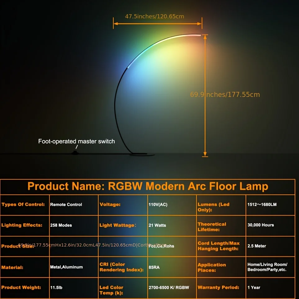 RGB Floor Lamp, Ultra Bright 1800LM Smart Arc LED Floor Lamp Music Sync, Scene Modes, Modern Standing Tall Lamp