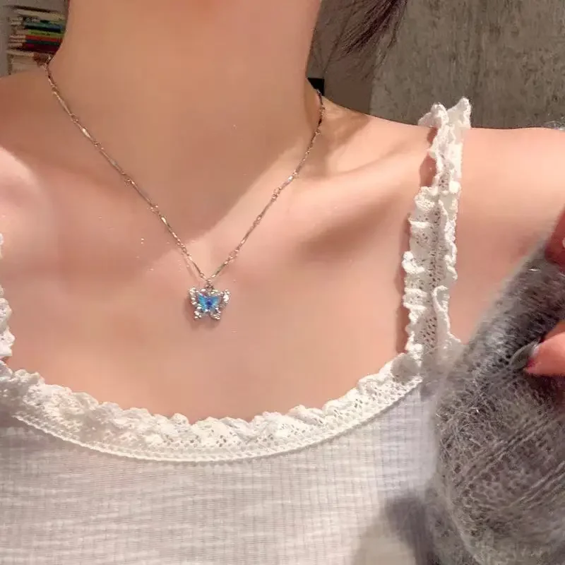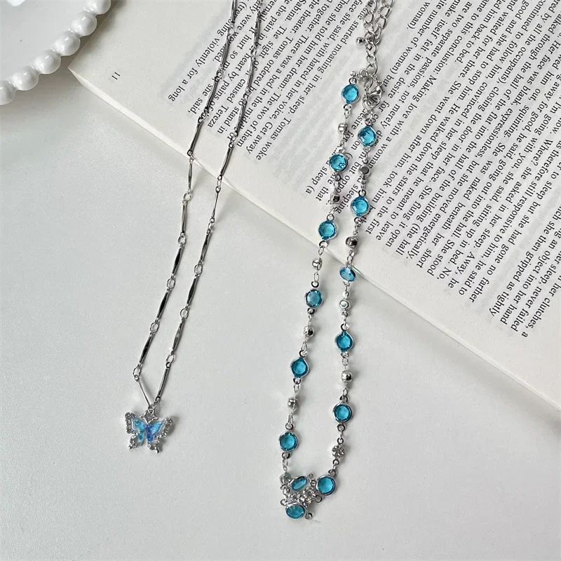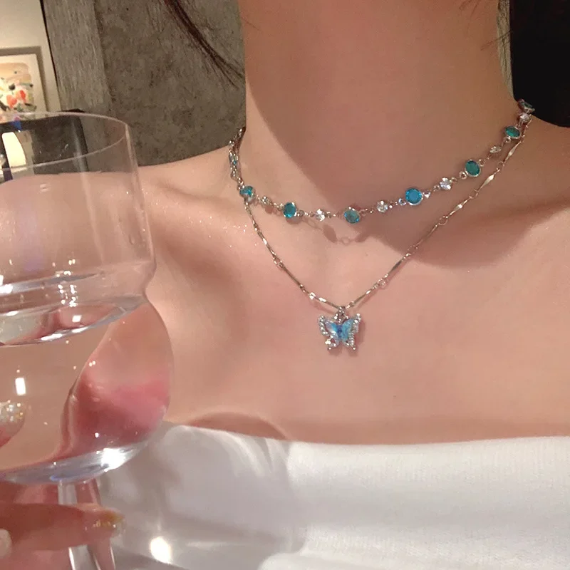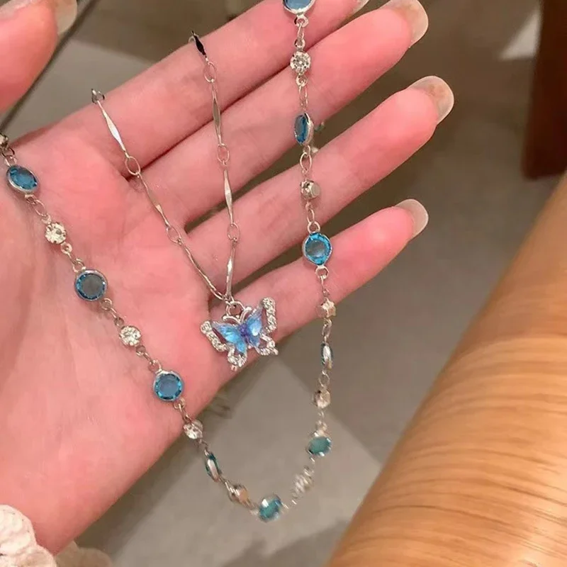 Romantic Blue Crystal Butterfly Necklace for Women Girls Simple Shiny Zircon Bilayer Choker Clavicle Chain New Fine Jewelry Gift