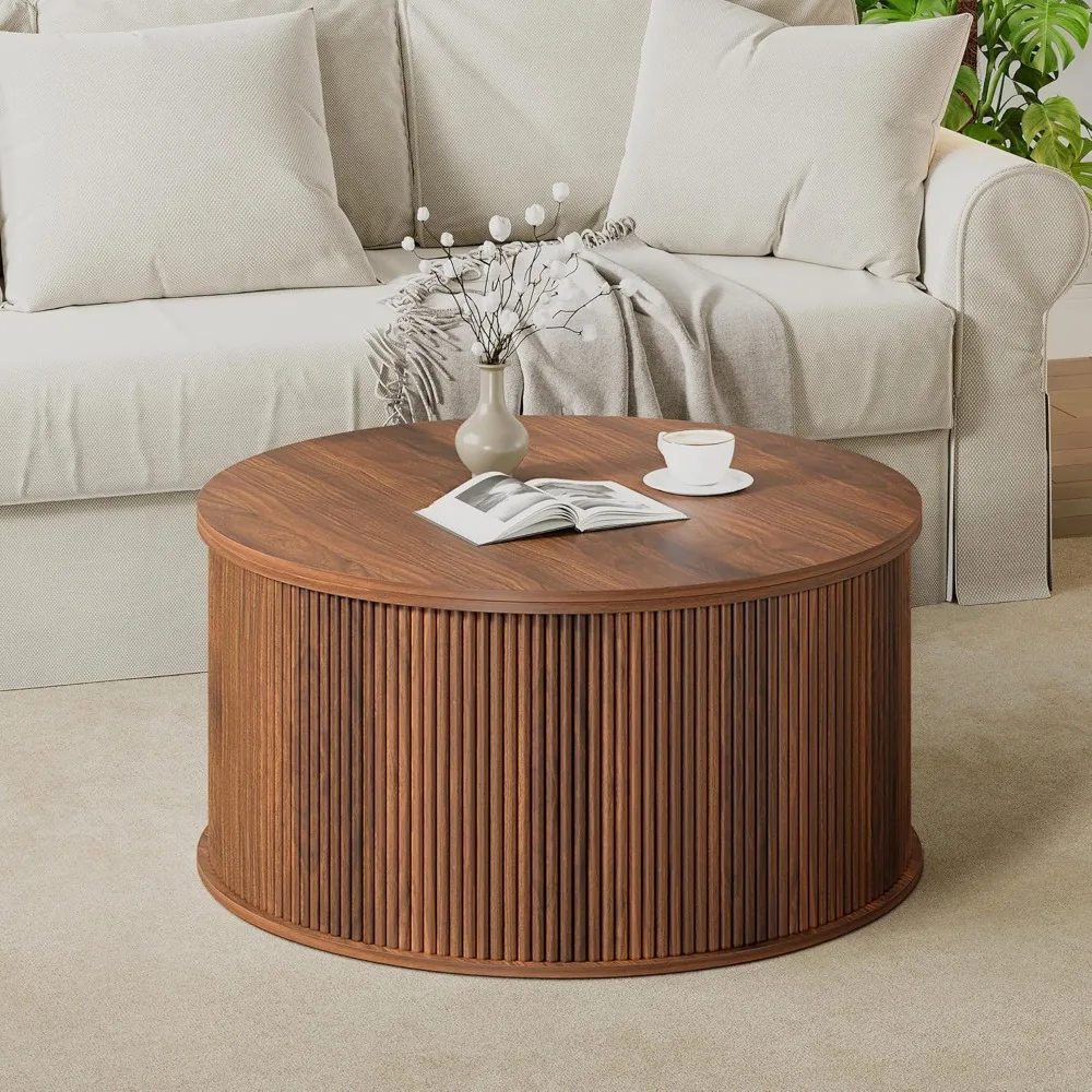 "Round Fluted Lift-Top Coffee Table with Storage for Farmhouse Style Living Room and Dining Area"