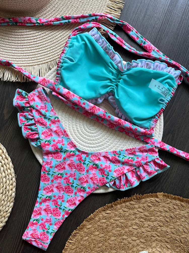 The ruffled edges on the top and bottom give the swimsuit a romantic and playful feel, perfect for a summer getaway.