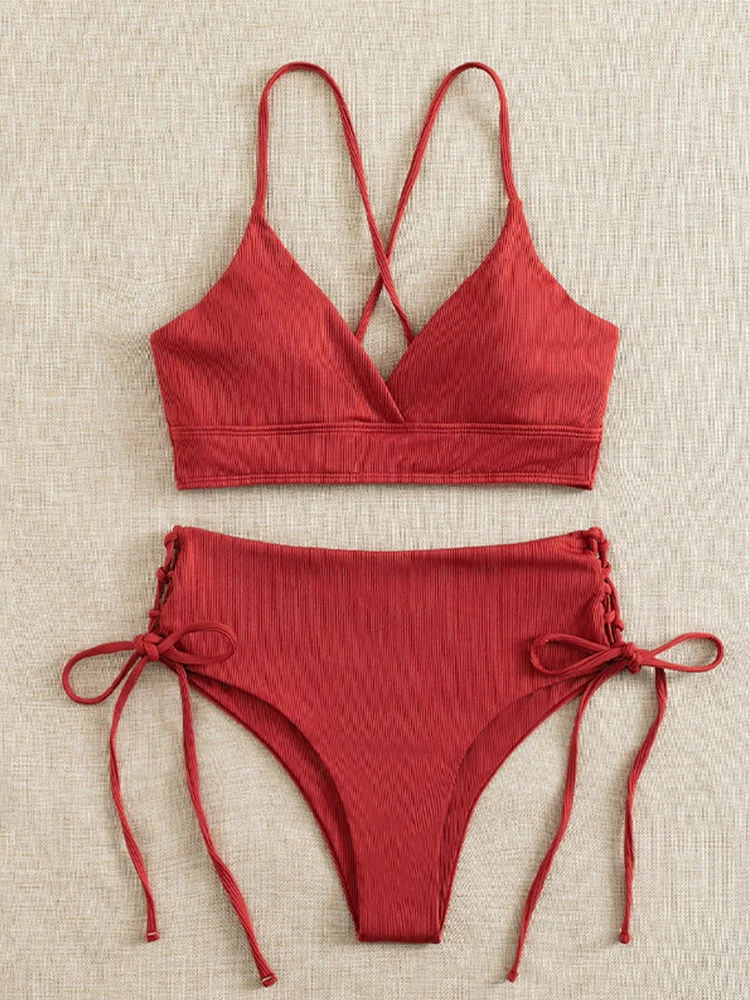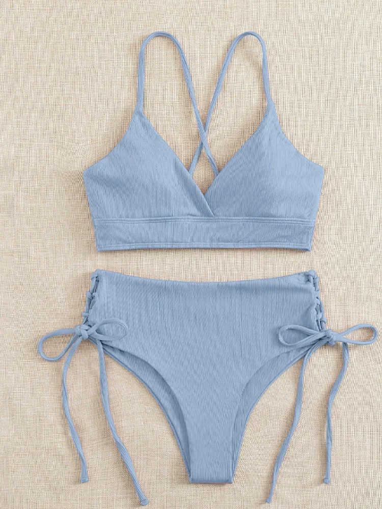 Sexy Solid V Neck Lace Up Bikinis 2 Piece Set Women Split Swimsuit High Waist Beach Bikinis 2025 New Summer Swimwear Bikinis Set