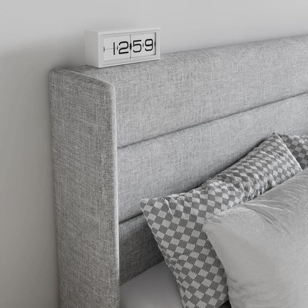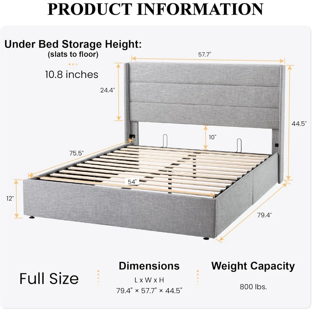 This item features a lift-up design for underneath storage, providing ample space for items like suitcases, storage bags, and boxes containing out-of-season bedding. The wingback headboard with horizontal channels adds a modern touch to your bedroom decor. The bed frame is equipped with a hydraulic lifting mechanism, making it easy to lift the platform and ensuring the mattress remains in place with a protective device. The contemporary horizontal channel headboard with wingback not only prevents the mattress from sliding but also keeps pillows from falling off. The stylish fabric design complements various room styles. Additionally, this full-size bed frame does not require a box spring, as it comes with solid, closely spaced wooden slats and plastic buckles, allowing it to support the mattress directly.
