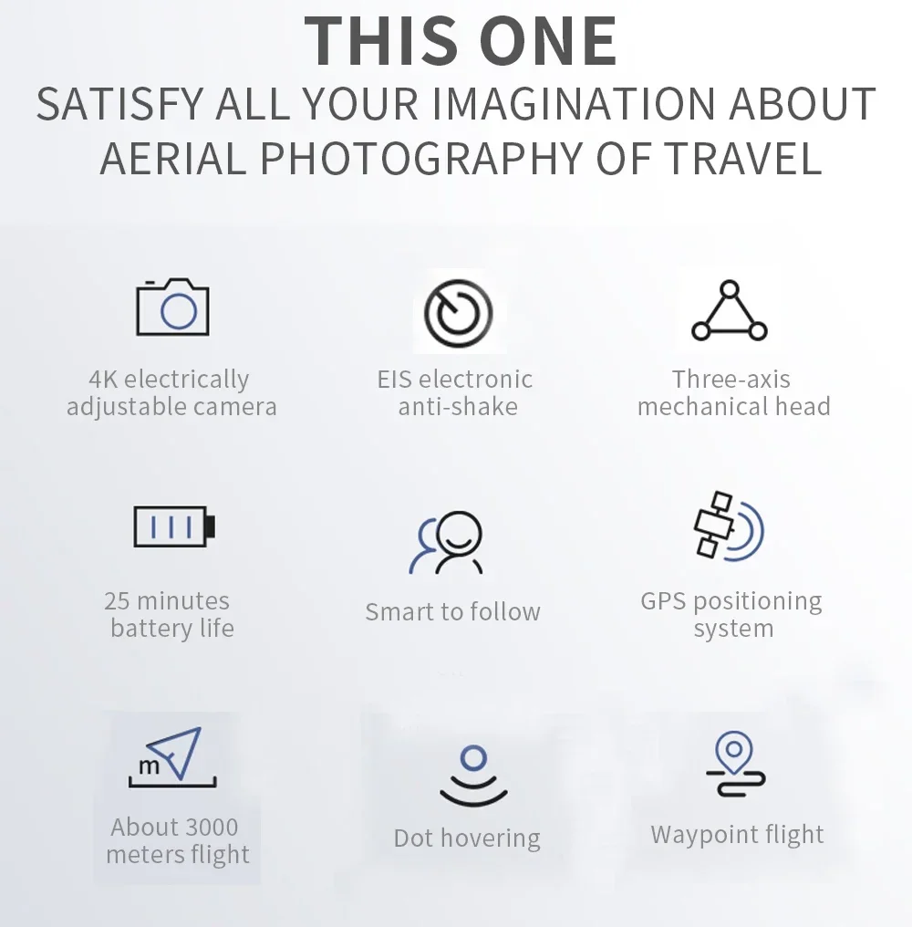 2: The 3-axis pan tilt lens is equipped with a wide-angle 4K high-definition WiFi, which can adjust the shooting angle of the front camera on the remote control. The 3-axis pan tilt makes the aircraft shooting video clearer and more stable, and the angle makes the field of vision wider