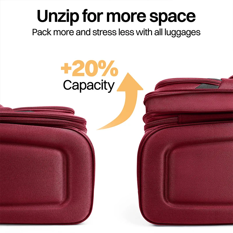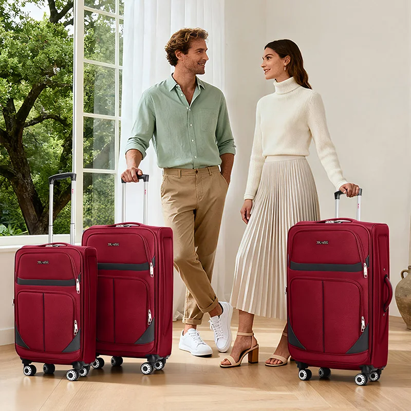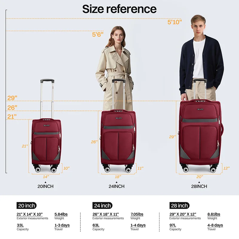 The softside suitcase body is made of high-quality fabric material, which has excellent flexibility and wear resistance, and can easily withstand all kinds of wear and tear during the journey.The spacious interior is large enough to hold everything you need during your trip. With an expandable function, it can increase the storage capacity by 20%, so you don't have to worry about having too much luggage anymore.The front of the luggage is designed with multiple zippered pockets, providing you with additional storage space. It is equipped with a retractable telescopic handle, and the universal wheels can rotate freely at 360 degrees, enabling the luggage to move flexibly.And at the corners and handles of the luggage, leather materials are selected for the design, adding a touch of luxury to the luggage and also improving its durability.