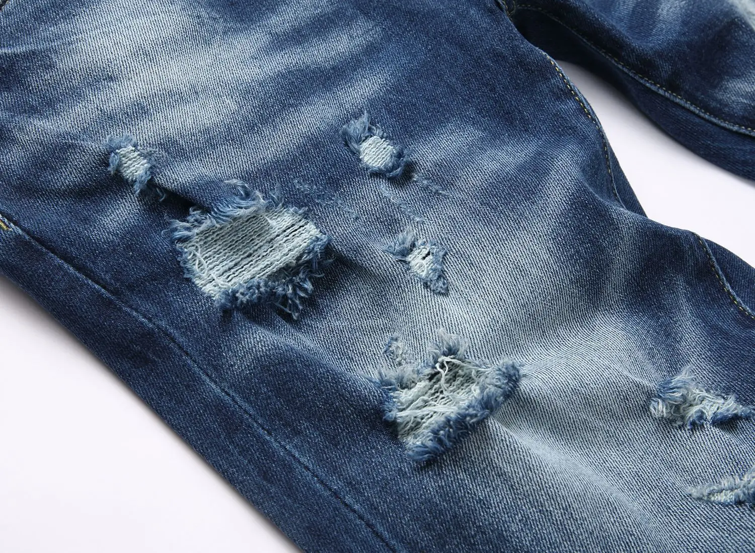 Streetwear Style Italian Men Blue Holes Denim Jeans Trousers Ripped Denim Long Pants High Quality Male Slim Denim Jeans Size 42