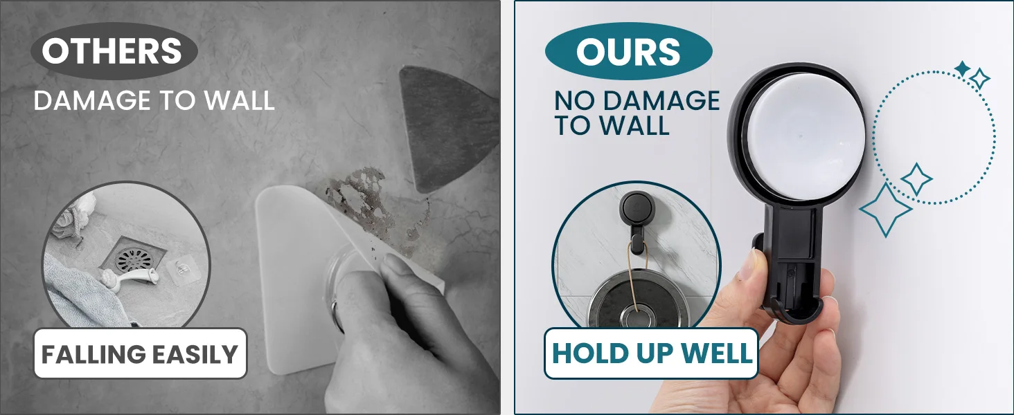 1 second installation: The suction cup shower hook stands out from other hooks because of its easy and rapid installation which cause zero damage to your wall. No drilling, No glue, No tools, No screws, No holes! Simply choose a smooth and dry surface and press the hook against the wall until you hear the sound "PUFF" which means the installation is done