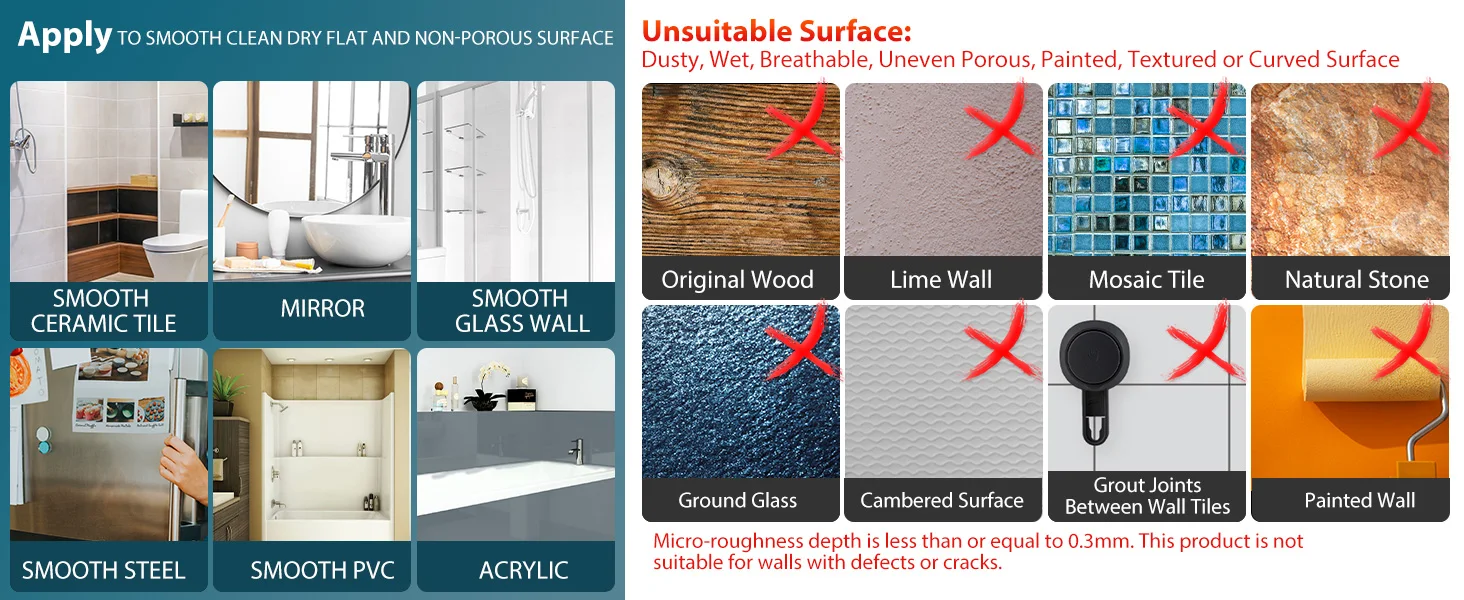 Warm tips: The suction cups are only stick on smooth, non-porous surfaces like metal, glass, tile, stainless steel and acrylic, but not apply to uneven tiles, texture plate, unfinished marble, painted wall, wallpaper