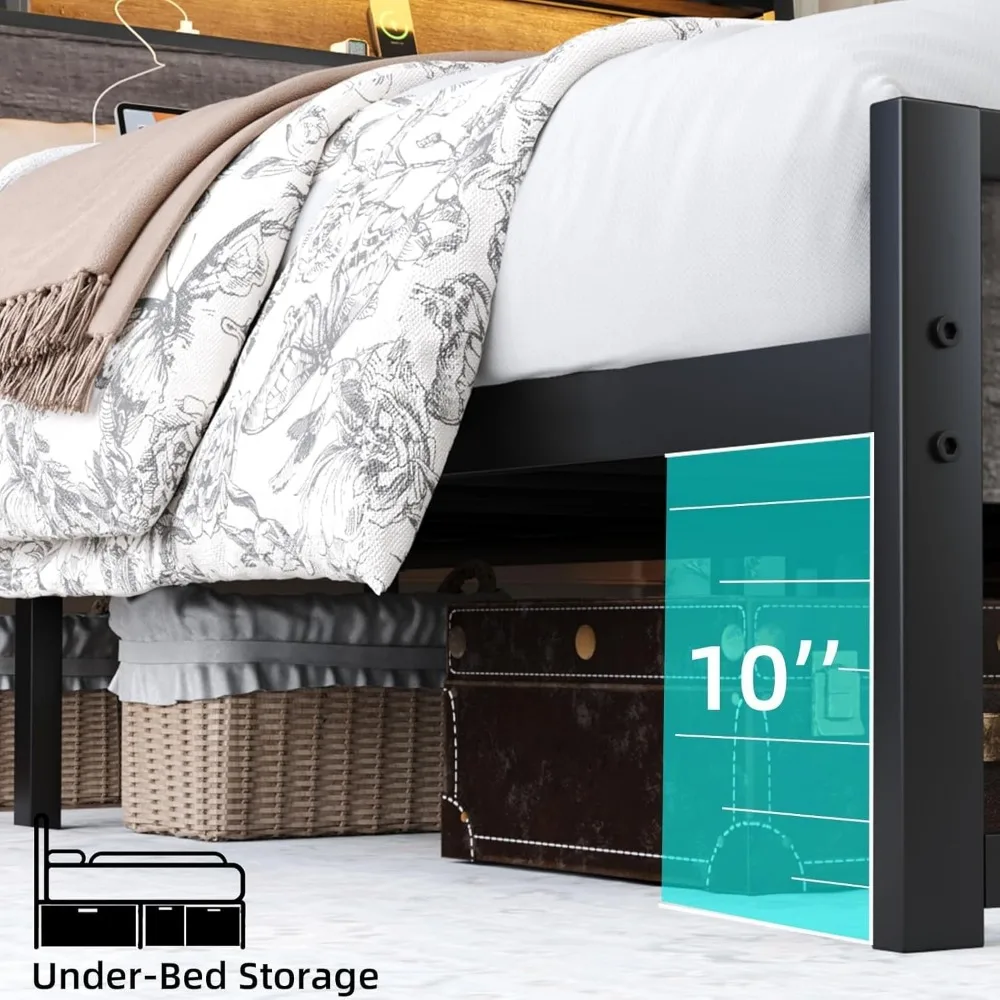 Twin Size Bed Frame with Built-in Charging Port and LED Lighting, Twin Bed Platform with Storage Headboard and Strong Steel Slat